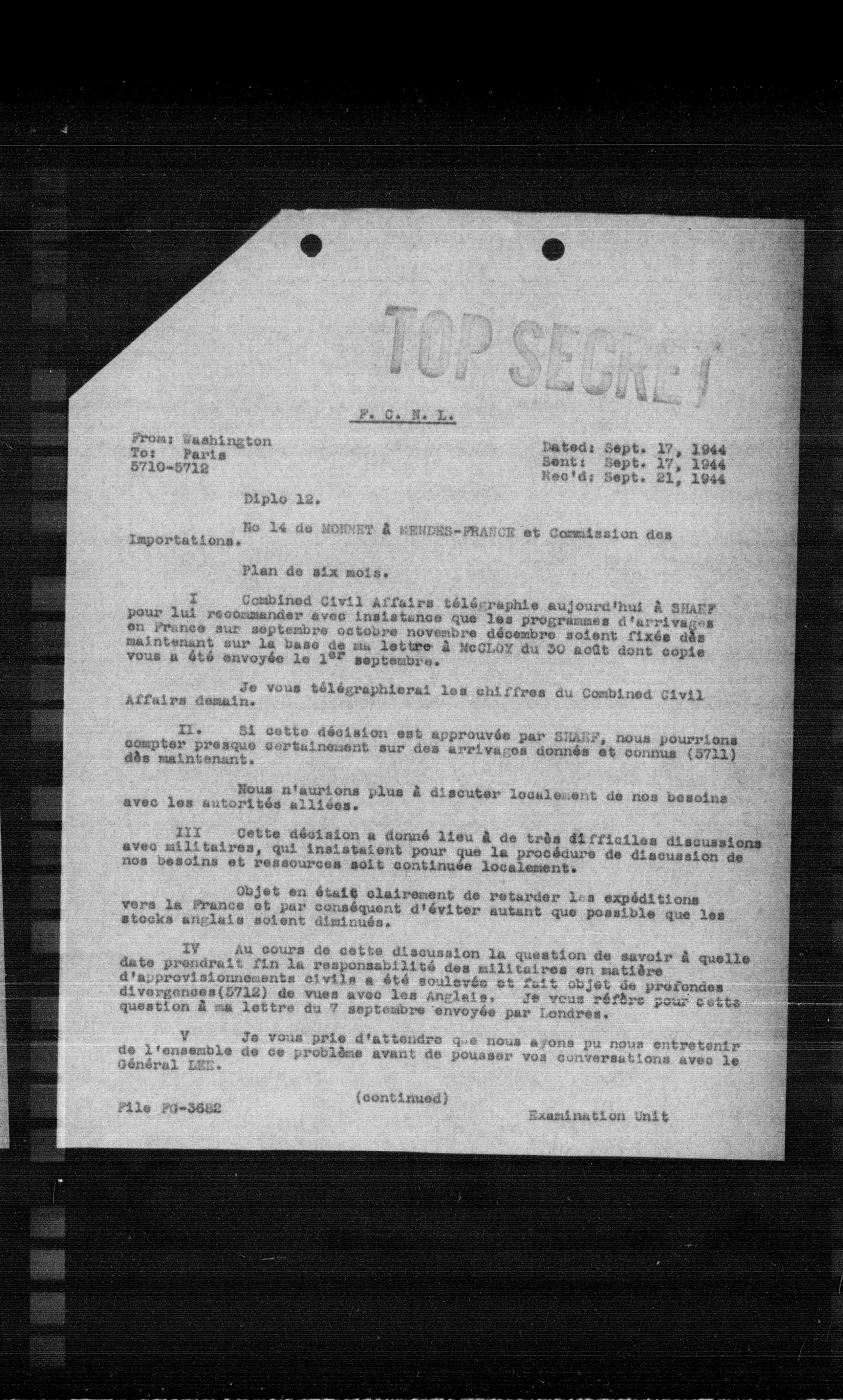I Combined Civil Affairs telegraphie aujourd'hui a SHARF pour lui recommander avec insistance que les programmes d'arrivages en France sur septembre octobre novembre décembre soient fixés des maintenant sur la base de ma lettre a McCLOY du 30 août dont copie vous a été envoyée le $1^{\text {er }}$ septembre.