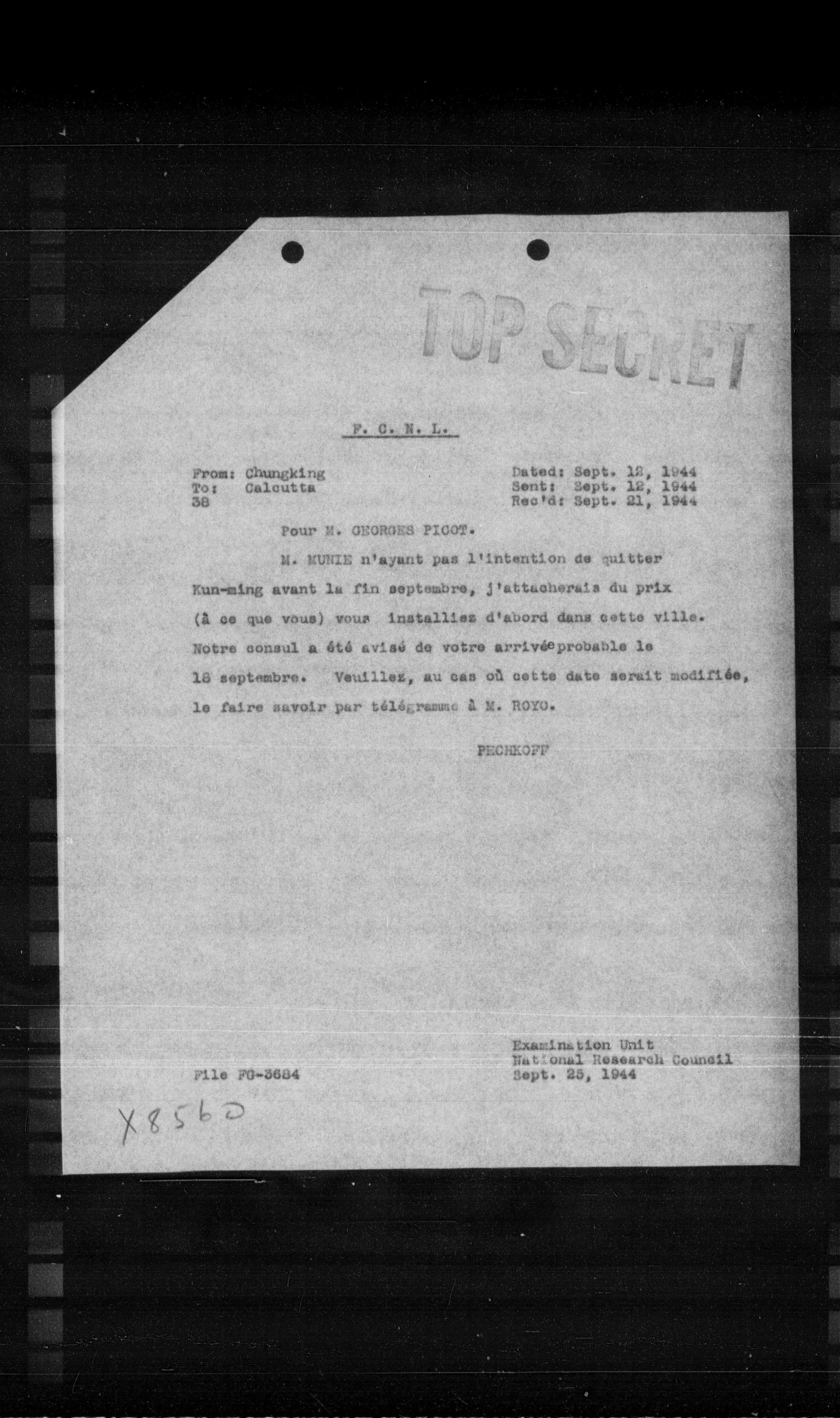 M. MUNIE n'ayant pas l'intention de quitter Kun-ming avant le fin septembre, j'attacherais du prix (à ce que vous) vous installiez d'abord dans cette ville. Notre consul a été avisé de votre arrivée probable le 18 septembre. Veuillez, au cas où cette date serait modifiée, le faire savoir par télégramme à M. ROYO.