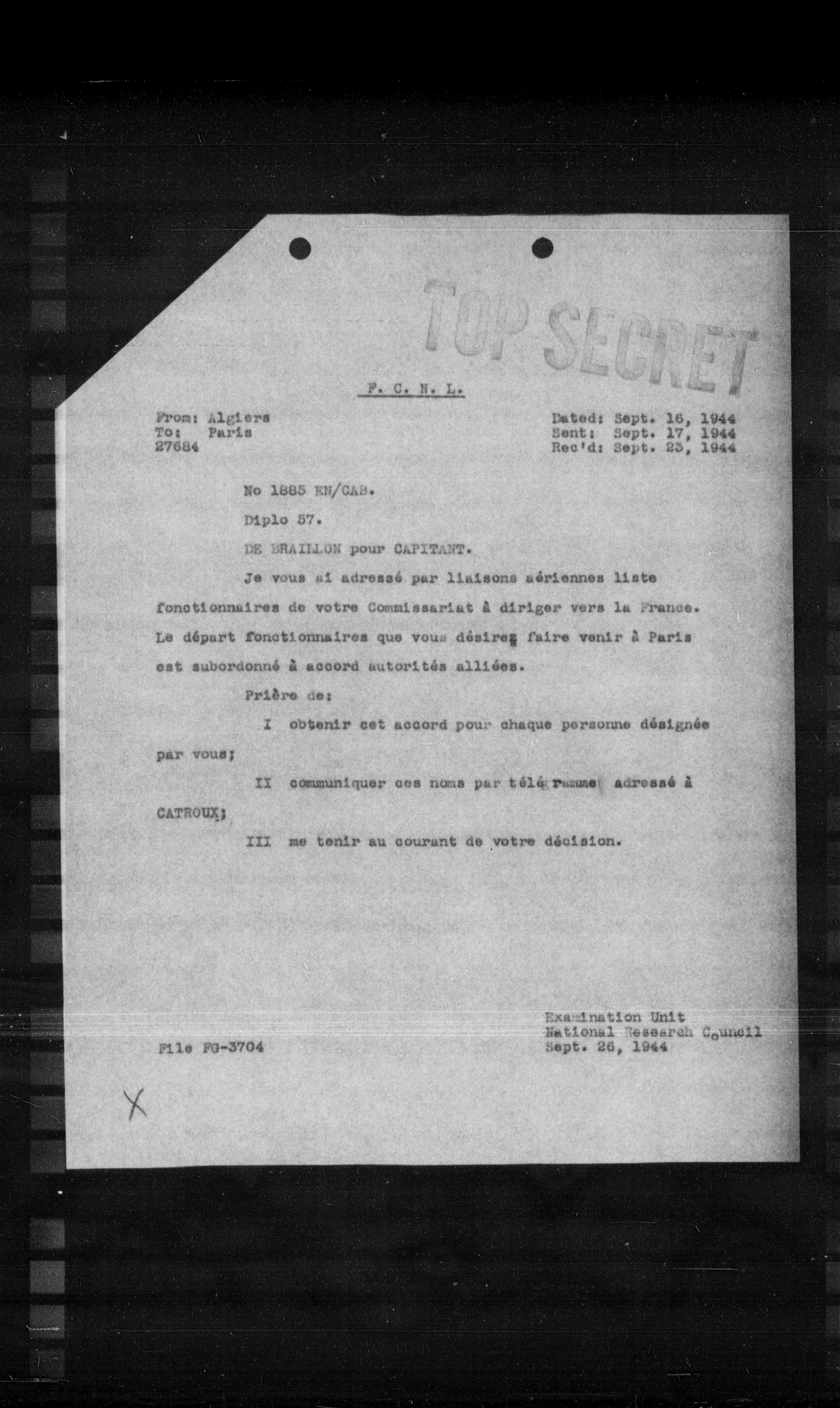 Je vous ai adressé par l'aisone aériennes liste fonctionnaires de votre Commissariat à diriger vers la France. Le départ fonctionnaires que vous désirez faire venir à Paris est subordonné à accord autorités alliées.