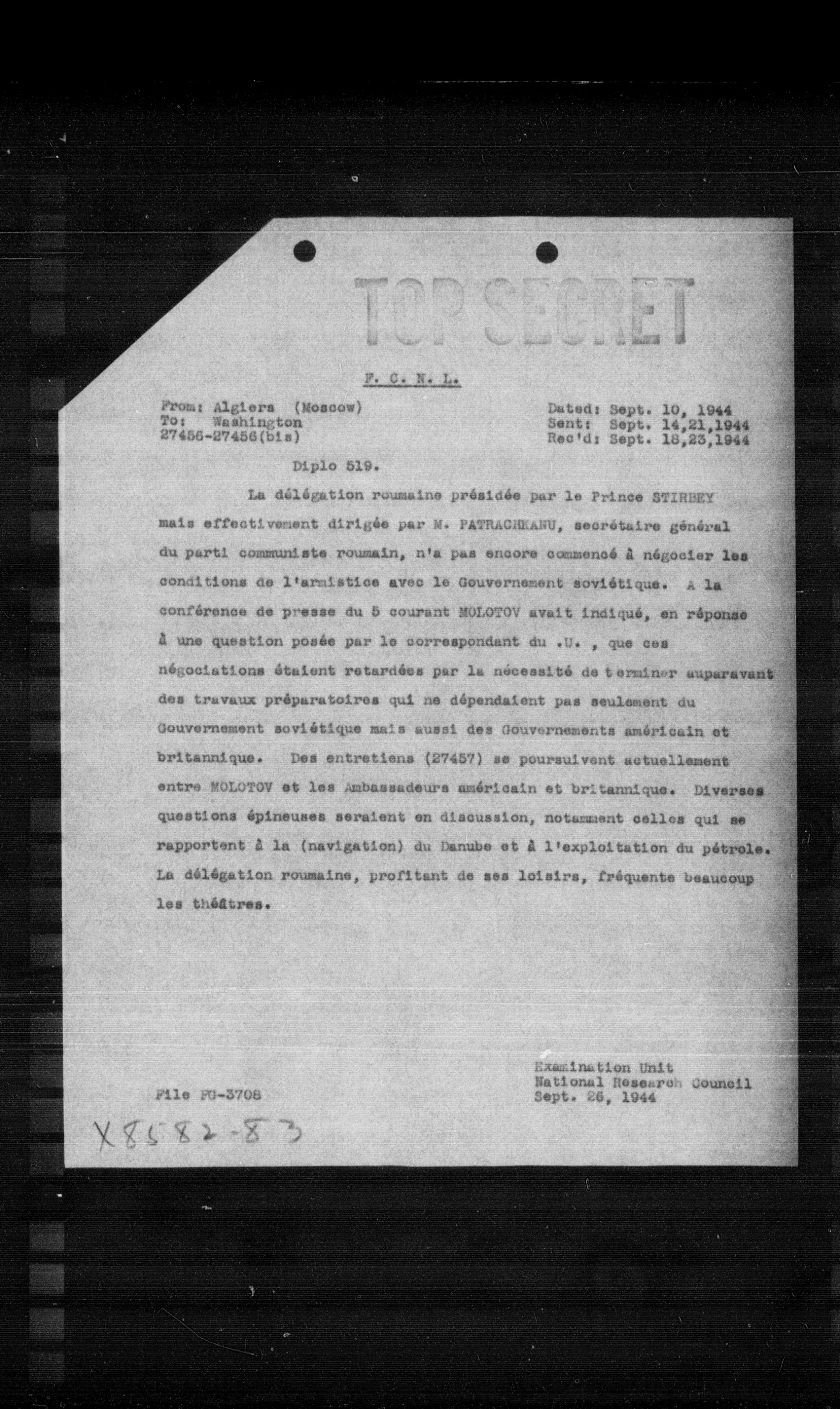 La délégation roumaine présidée par le Prince STIRBEY mais effectivement dirigée par M. PATRAGHEANU, secrétaire général du parti communiste roumain, n'a pas encore commencé à négocier les conditions de l'armistice avec le Gouvernement soviétique. A la conférence de presse du 5 courant MOLOTOV avait indiqué, en réponse à une question posée par le correspondant du .U., que ces négociations étaient retardées par la nécessité de terminer auparavant des travaux préparatoires qui ne dépendaient pas seulement du Gouvernement soviétique mais aussi des Gouvernements américain et britannique. Des entretiens (27457) se poursuivent actuellement entre MOLOTOV et les Ambassadeurs américain et britannique. Diverses questions épineuses seraient en discussion, notamment celles qui se rapportent à la (navigation) du Danube et à l'exploitation du pétrole. La délégation roumaine, profitant de ses loisirs, fréquente beaucoup les théâtres.