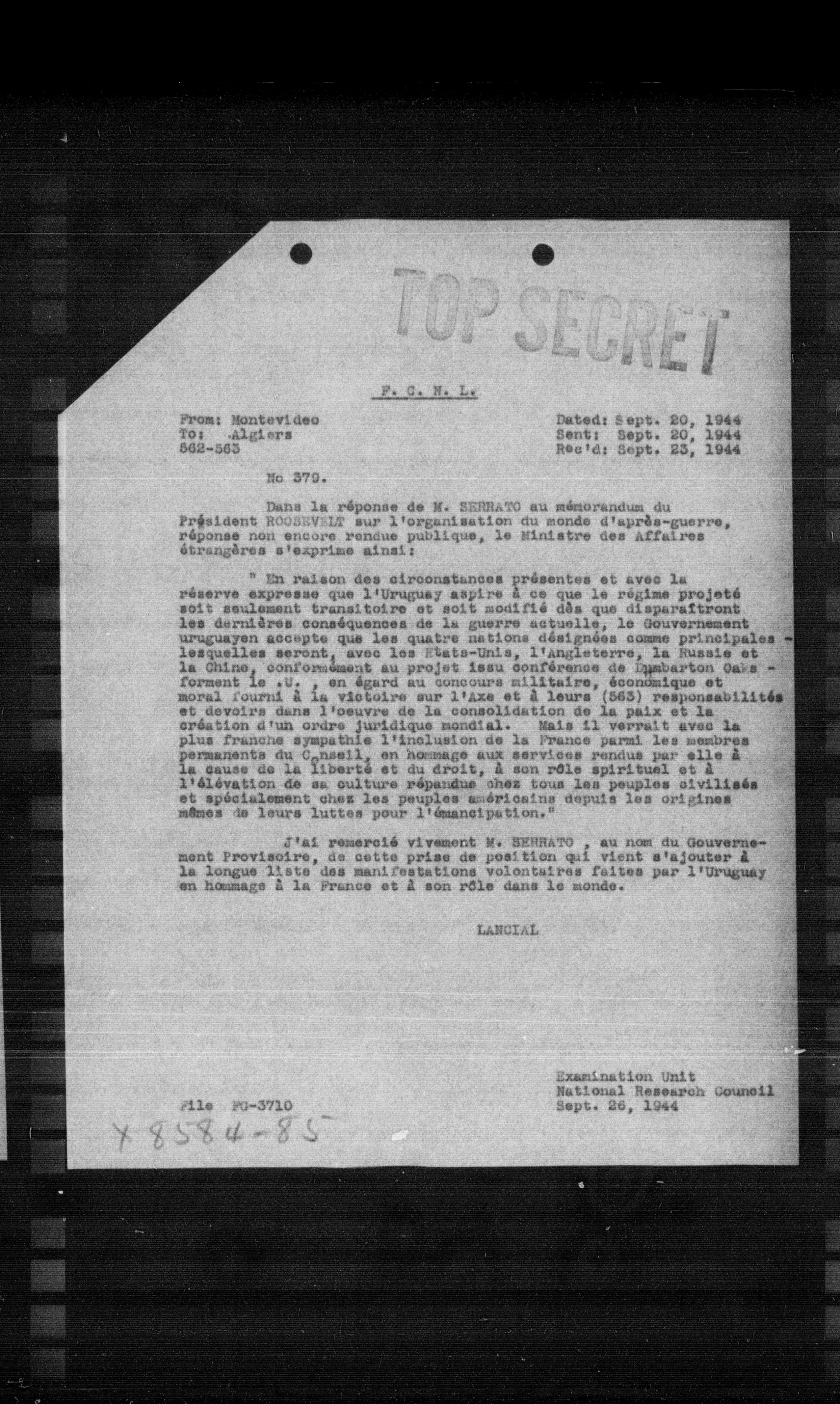 "En raison des circonstances présentes et avec la réserve expresse que l'Uruguay aspire à ce que le régime projeté soit seulement transitoire et soit modifié dès que disparaîtront les dernières conséquences de la guerre actuelle, le Gouvernement uruguayen accepte que les quatre nations désignées comme principales lesquelles seront, avec les États-Unis, l'Angleterre, la Russie et la Chine, conformément au projet issu conférence de l'Ambarton Oaks - forment le .C., en égard au concours militaire, économique et moral fourni à la victoire sur l'axe et à leurs (563) responsabilités et devoirs dans l'œuvre de la consolidation de la paix et la création d'un ordre juridique mondial. Mais il verrait avec la plus franche sympathie l'inclusion de la France parmi les membres permanents du Conseil, en hommage aux services rendus par elle à la cause de la liberté et du droit, à son rôle spirituel et à l'élévation de sa culture répandue chez tous les peuples civilisés et spécialement chez les peuples américains depuis les origines mêmes de leurs luttes pour l'émancipation."
