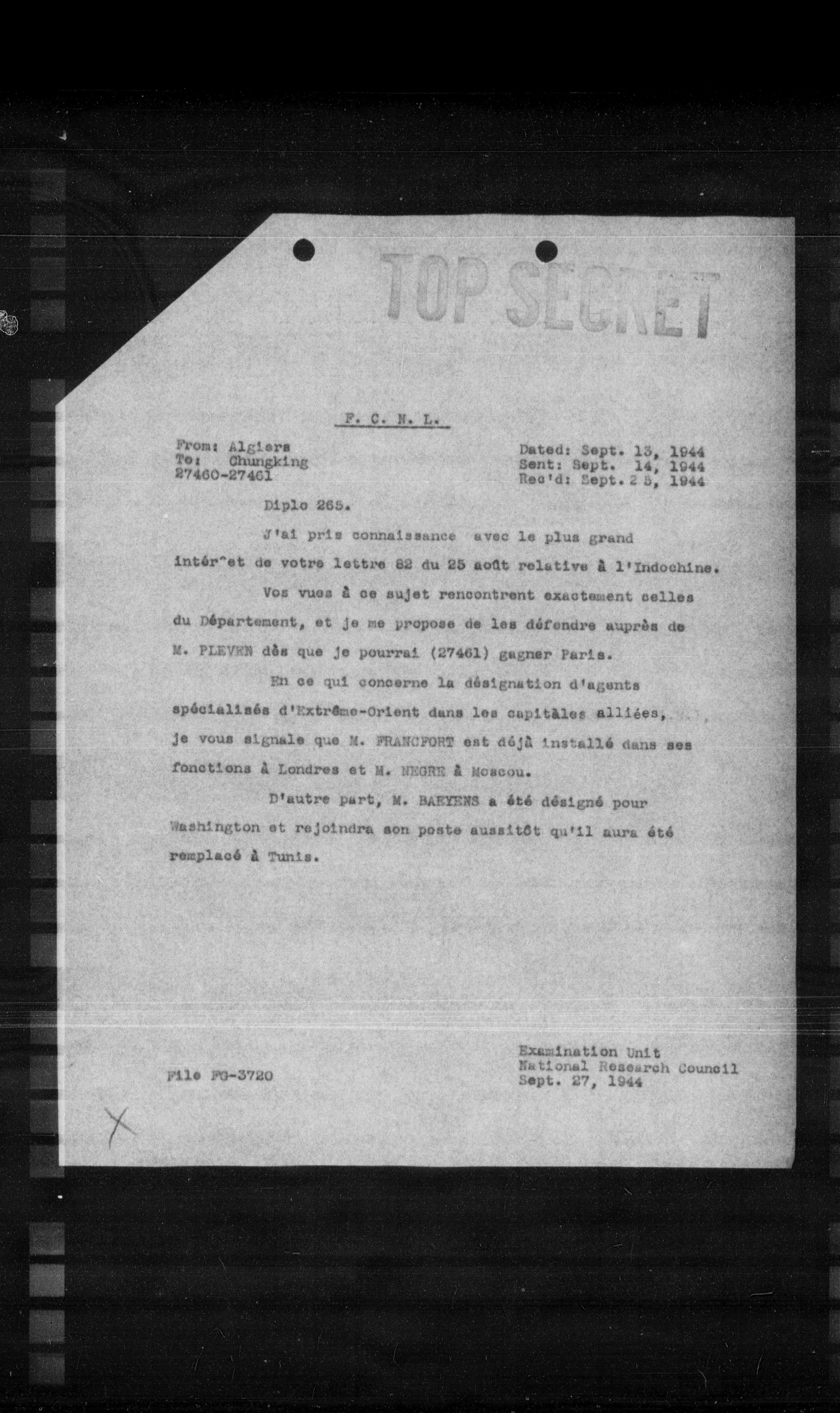 En ce qui concerne la désignation d'agents spécialisés d'Extrême-Orient dans les capitales alliées, je vous signale que M. FRANCPORT est déjà installé dans ses fonctions à Londres et M. NEGRE à Moscou.