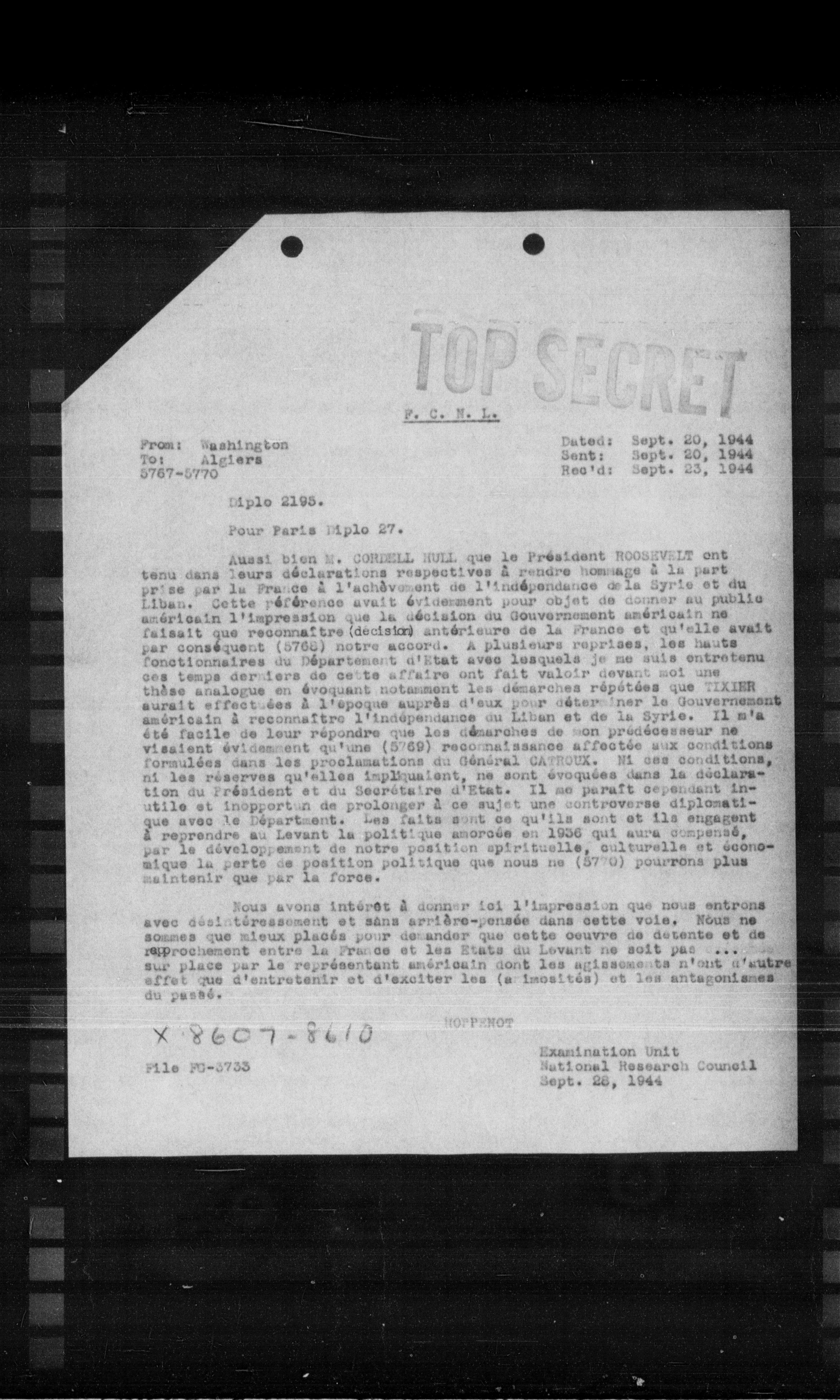 Aussi bien M. CORDELL HULL que le Président ROOSEVELT ont tenu dans leurs déclarations respectives à rendre nommage à la part prise par la France à l'achèvement de l'indépendance de la Syrie et du Liban. Cette référence avait évidemment pour objet de donner au public américain l'impression que la décision du Gouvernement américain ne faisait que reconnaître (décision antérieure de la France et qu'elle avait par conséquent (5768) notre accord. A plusieurs reprises, les hauts fonctionnaires du Département d'Etat avec lesquels je me suis entretenu ces temps derniers de cette affaire ont fait valoir devant moi une thèse analogue en évoquant notamment les démarches répétées que TIXIER aurait effectuées à l'époque auprès d'eux pour déterminer le Gouvernement américain à reconnaître l'indépendance du Liban et de la Syrie. Il m'a été facile de leur répondre que les démarches de mon prédécesseur ne visaient évidemment qu'une (5769) reconnaissance affectée aux conditions formulées dans les proclamations du Général GAYROUX. Et ces conditions, ni les réserves qu'elles impliquaient, ne sont évoquées dans la déclaration du Président et du Secrétaire d'Etat. Il me paraît cependant inutile et inopportun de prolonger à ce sujet une controverse diplomatique avec le Département. Les faits sont ce qu'ils sont et ils engagent à reprendre au Levant la politique amorcée en 1936 qui aura compensé, par le développement de notre position spirituelle, culturelle et économique la perte de position politique que nous ne (5770) pourrons plus maintenir que par la force.
