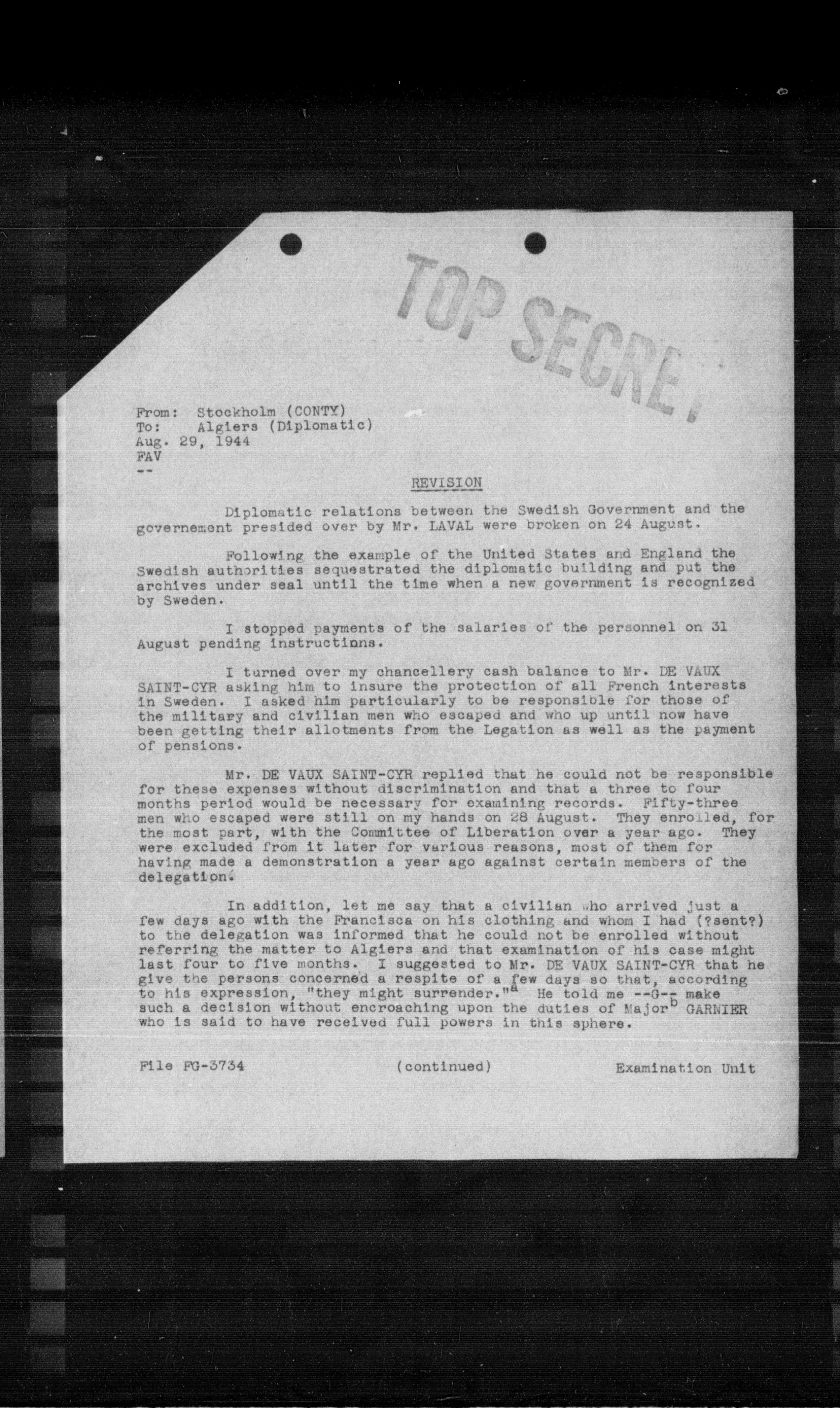 I turned over my chancellery cash balance to Mr. DE VAUX SAINT-CYR asking him to insure the protection of all French interests in Sweden. I asked him particularly to be responsible for those of the military and civilian men who escaped and who up until now have been getting their allotments from the Legation as well as the payment of pensions.