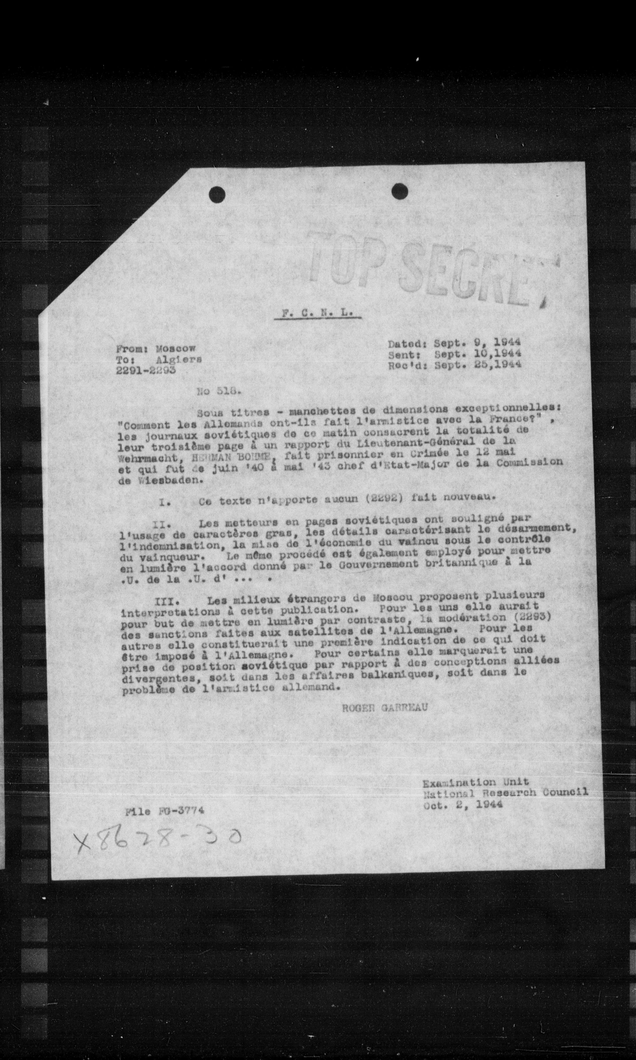 "Comment les Allemands ont-ils fait l'armistice avec la France?", les journaux soviétiques de ce matin consacrent la totalité de leur troisième page à un rapport du Lieutenant-General de la Wehrmacht, ROMEAN BOUME, fait prisonnier en Crimée le 12 mai et qui fut ce juin '40 à mai '43 chef d'Etat-Major de la Commission de Wiesbaden.