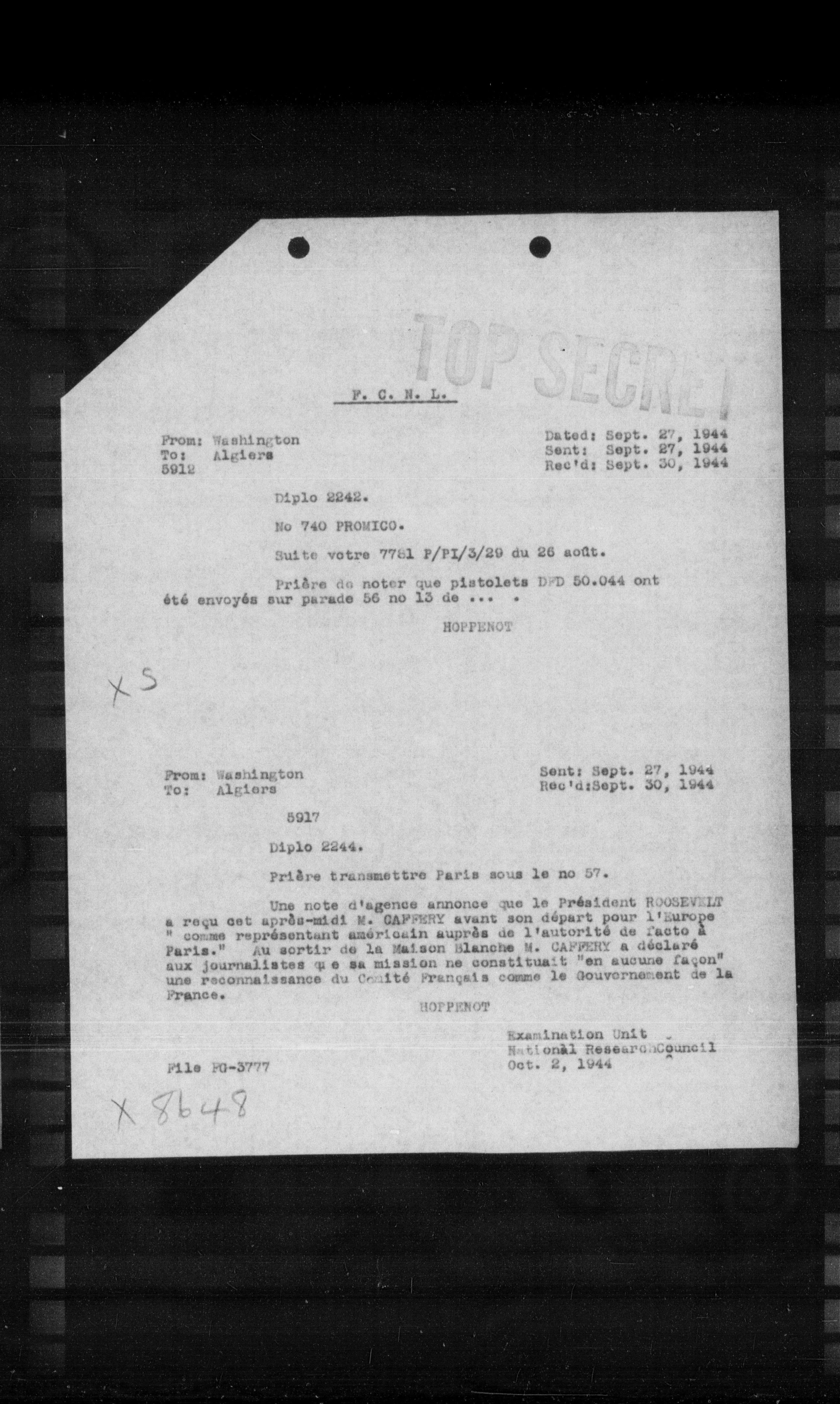 Une note d'agence annonce que le Président ROOSEVELT a reçu cet après-midi M. CAFFENY avant son départ pour l'Europe comme représentant américain auprès de l'autorité de l'Acte à Paris. Au sortir de la Maison Blanche, M. CAFFENY a déclaré aux journalistes que sa mission ne constituait "en aucune façon" une reconnaissance du Comité Français comme le Gouvernement de la France.