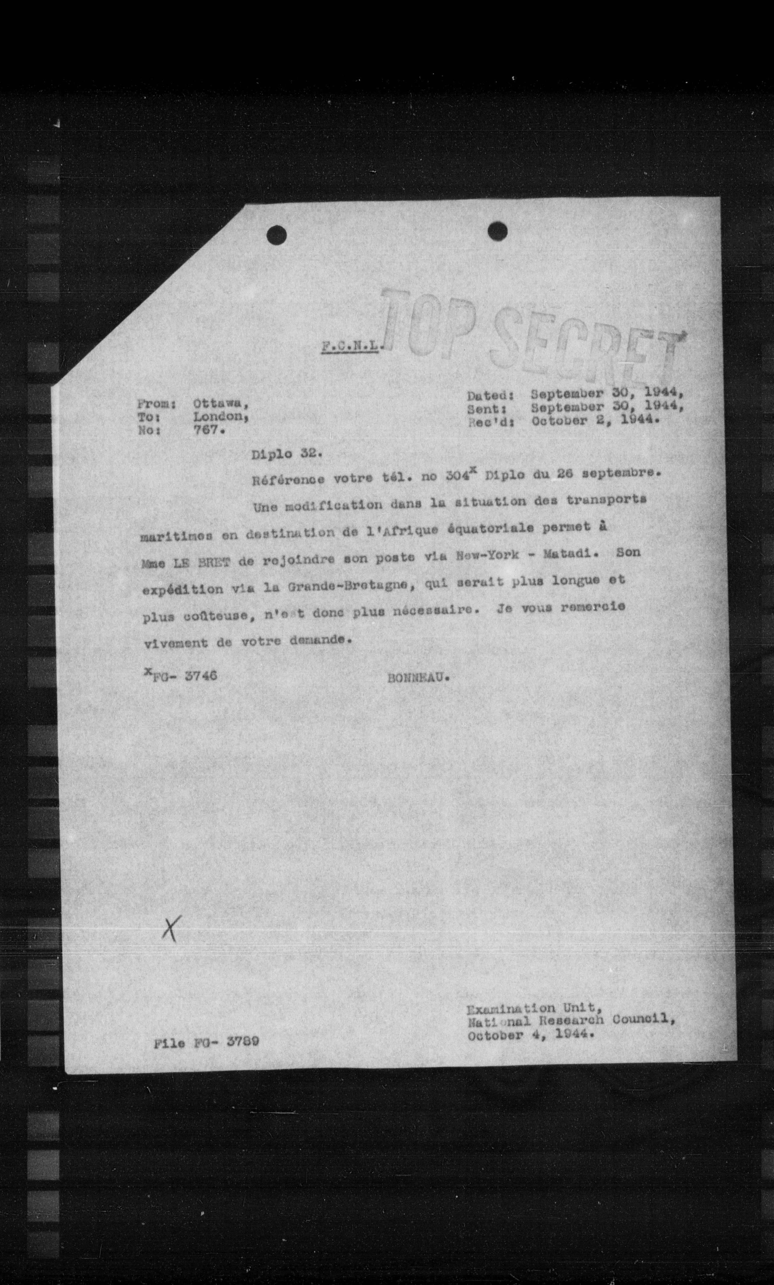 From: Ottawa, Date: September 30, 1944, To: London, Sent: September 30, 1944, No: 767. Rec'd: October 2, 1944.