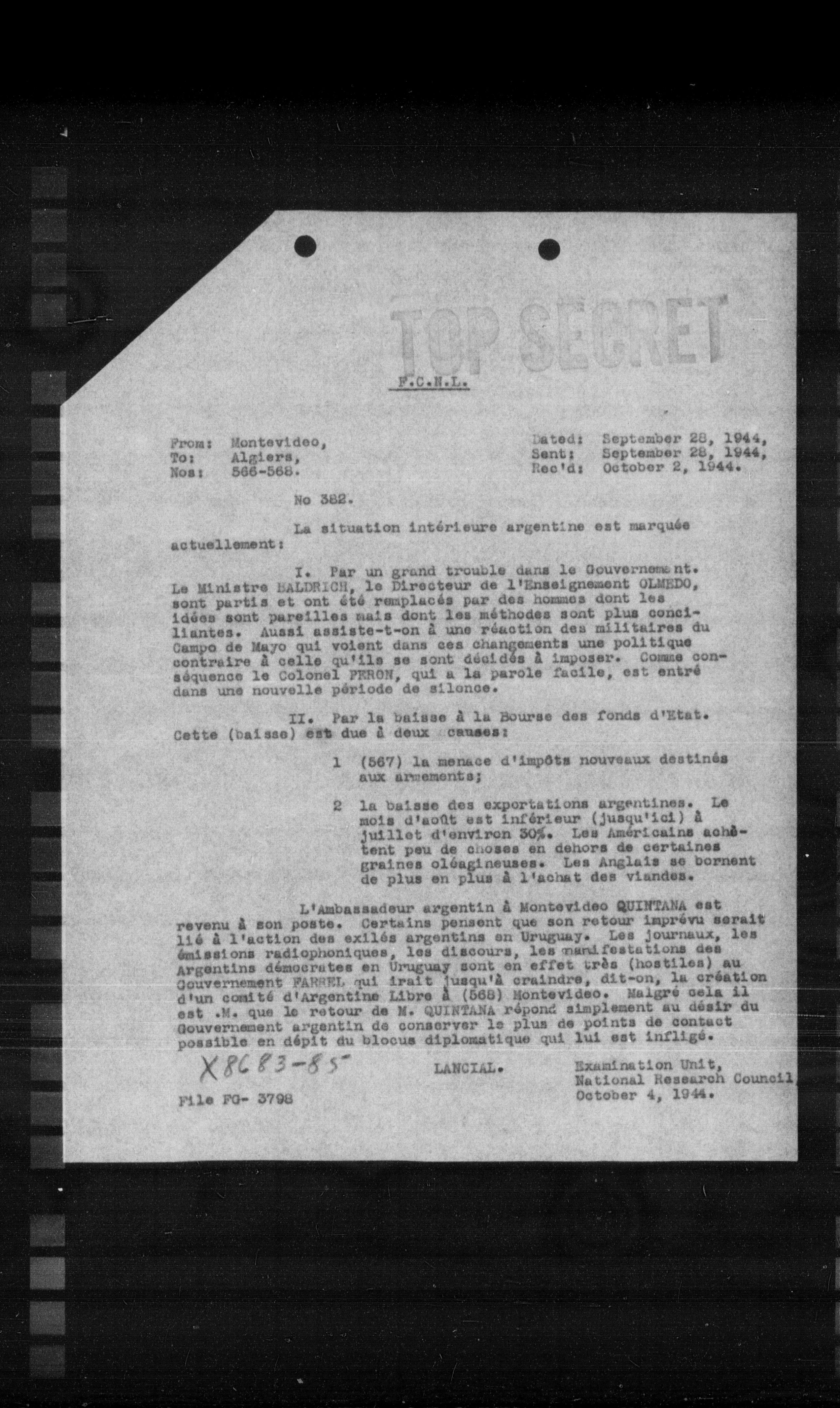 L'Ambassadeur argentin à Montevideo QUINTANA est revenu à son poste. Certains pensent que son retour imprévu serait lié à l'action des exilés argentins en Uruguay. Les journaux, les émissions radiophoniques, les discours, les manifestations des Argentins démocrates en Uruguay sont en effet très (hostiles) au Gouvernement FARREL qui trait jusqu'à craindre, dit-on, la création d'un comité d'Argentine Libre à (568) Montevideo. Malgré cela il est : M. que le retour de M. QUINTANA répond simplement au désir du Gouvernement argentin de conserver le plus de points de contact possible en dépit du blocus diplomatique qui lui est infligé.