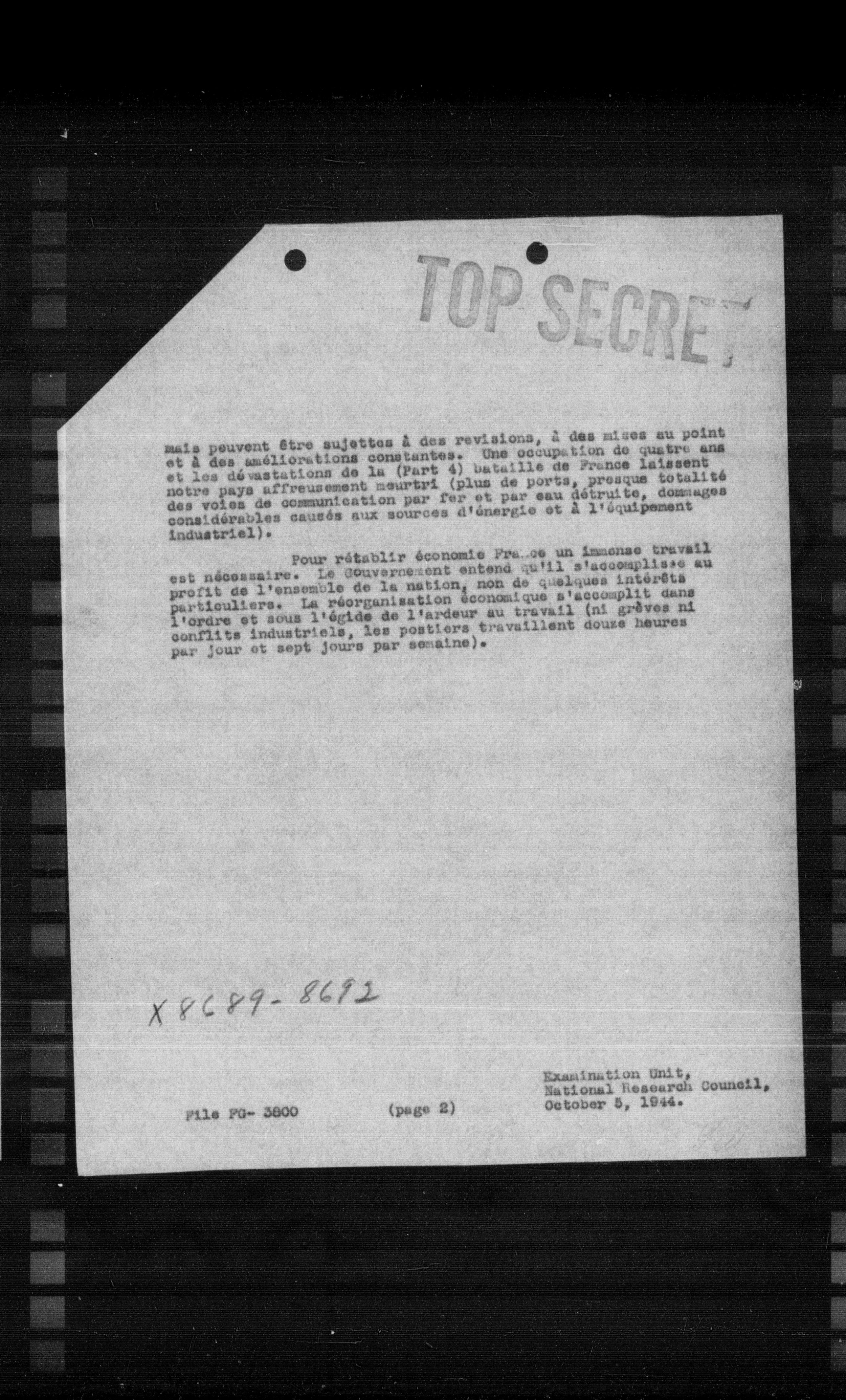 Pour rétablir économie France un immense travail est nécessaire. Le Gouvernement entend qu'il s'accomplisse au profit de l'ensemble de la nation, non de quelques intérêts particuliers. La réorganisation économique s'accomplit dans l'ordre et sous l'égide de l'ardeur au travail (ni grèves ni conflits industriels, les postiers travaillent douze heures par jour et sept jours par semaine).