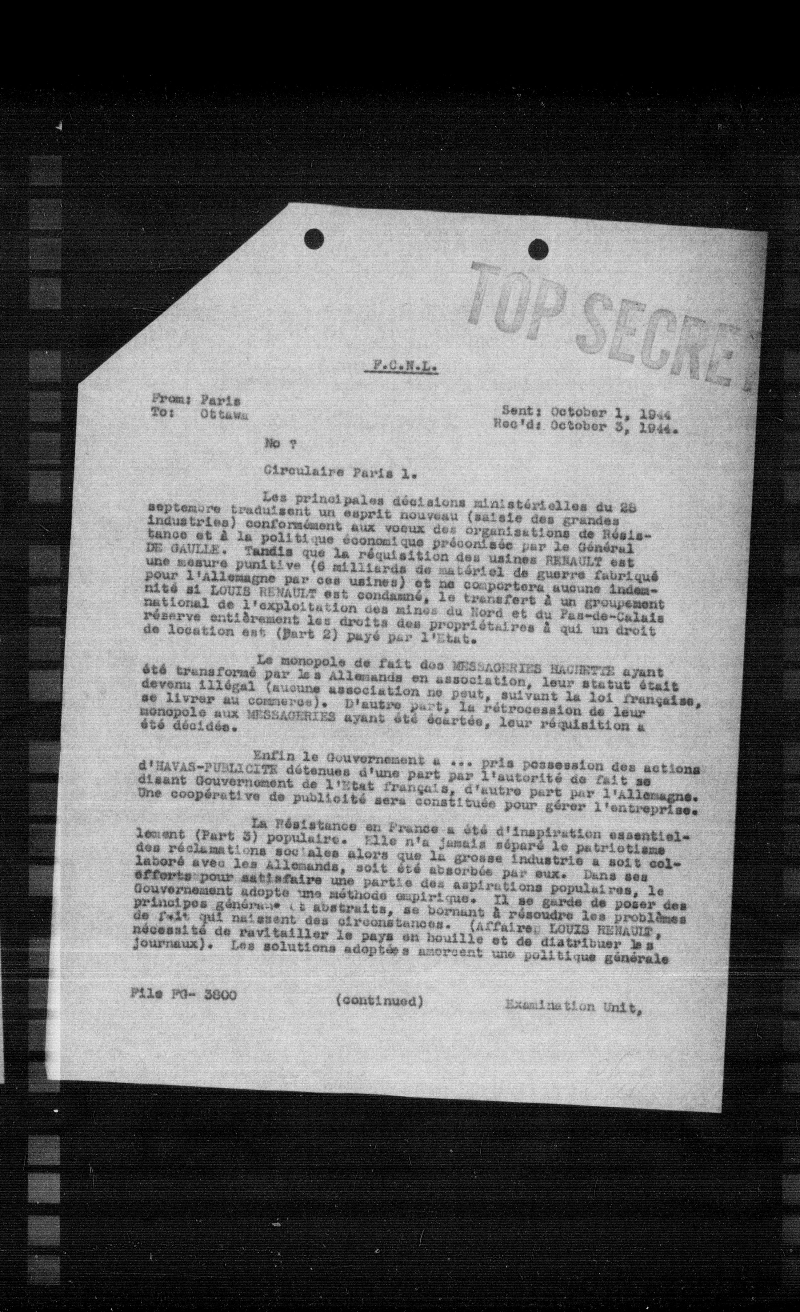Les principales décisions ministérielles du 25 septembre traduisent un esprit nouveau (saisie des grandes industries) conformément aux vœux des organisations de Résistance et à la politique économique préconisée par le Général DE GAULLE. Tandis que la régulation des usines RENAULT est une mesure punitive (6 milliards de matériel de guerre fabriqué pour l'Allemagne par ces usines) et ne comportera aucune indemnité si LOUIS RENAULT est condamné, le transfert à un groupement national de l'exploitation des mines du Nord et du Pas-de-Calais réserve entièrement les droits des propriétaires à qui un droit de location est (part 2) payé par l'État.
