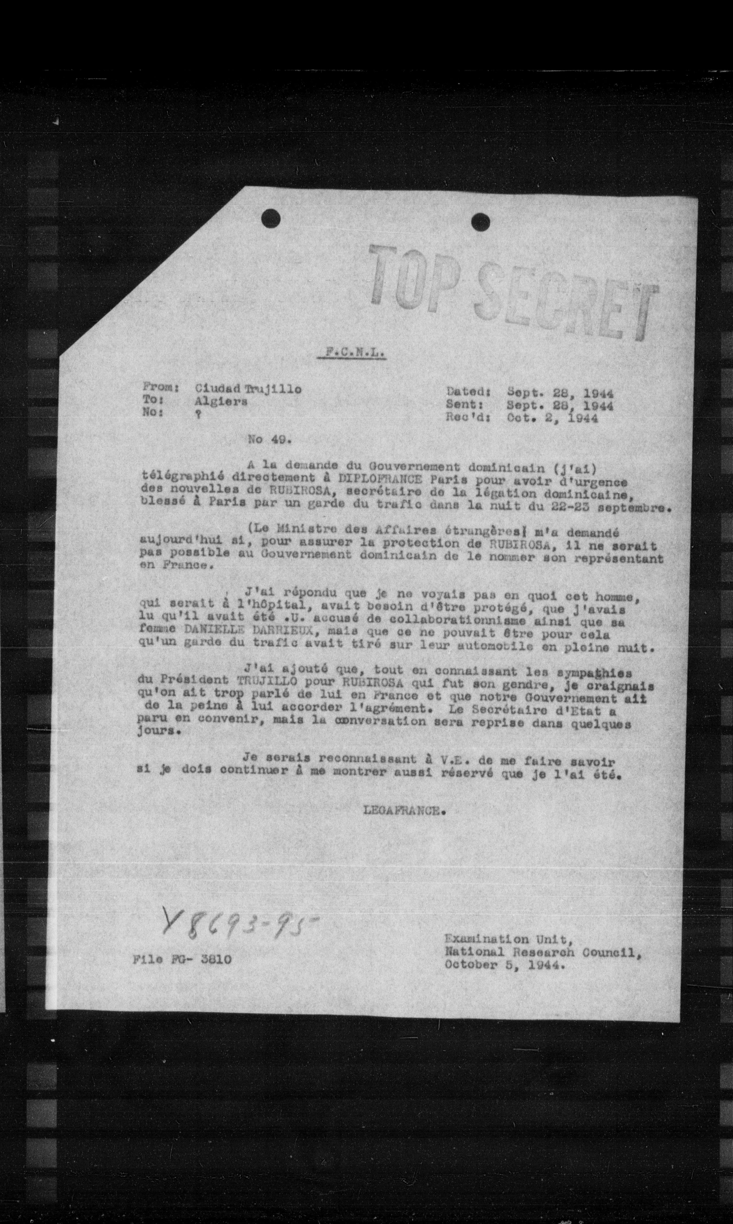 A la demande du Gouvernement dominicain (j'ai) télégraphié directement à DIPLOPHANCE Paris pour avoir d'urgence des nouvelles de RUSIROBA, secrétaire de la légation dominicaine, blessé à Paris par un garde du trafic dans la nuit du 22-23 septembre.