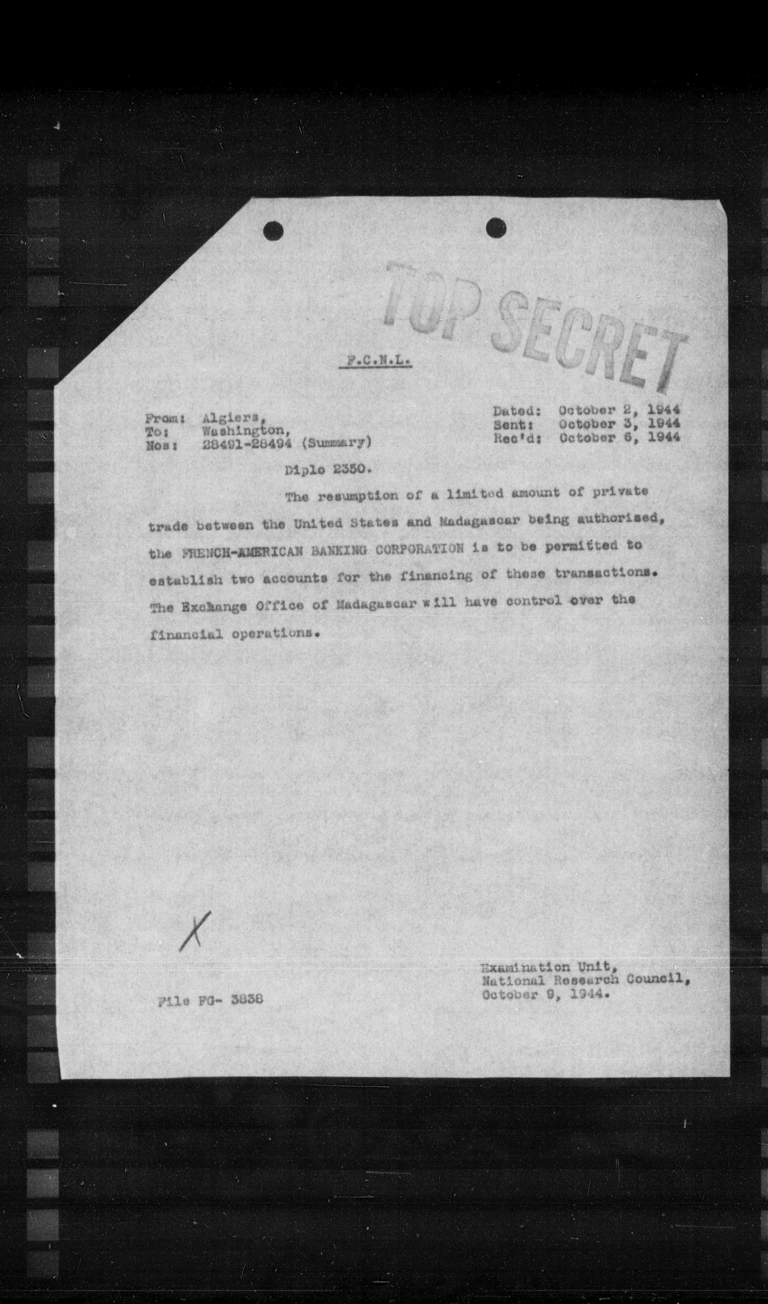 The resumption of a limited amount of private trade between the United States and Madagascar being authorized, the FRENCH-AMERICAN BANKING CORPORATION is to be permitted to establish two accounts for the financing of these transactions. The Exchange Office of Madagascar will have control over the financial operations.