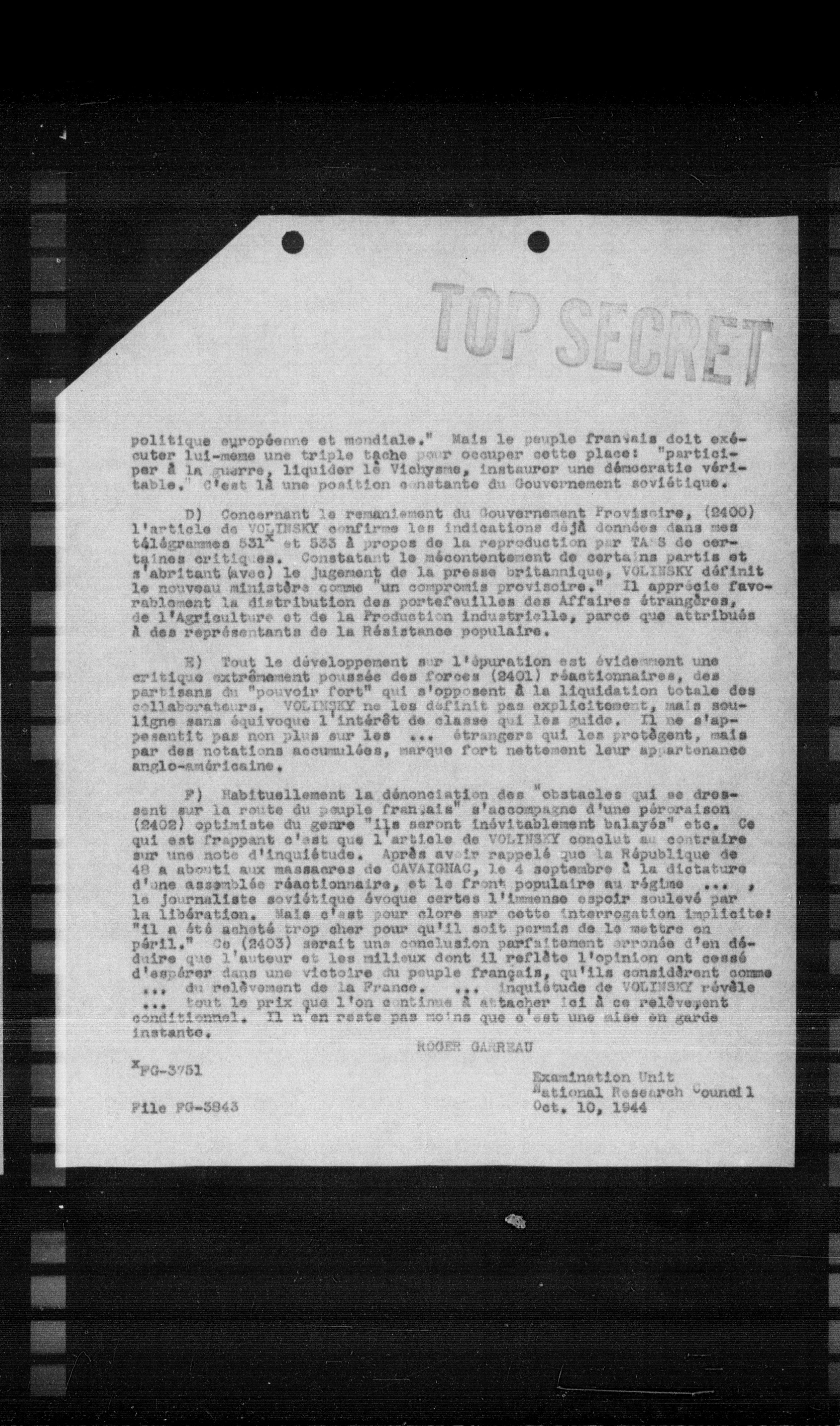 F) Habituellement la dénonciation des "obstacles qui se dressent sur la route du peuple français" s'accompagne d'une péroraison (2402) optimiste du genre "ils seront inévitablement balayés" etc. Ce qui est frappant c'est que l'article de VOLINSKY conclut au contraire sur une note d'inquiétude. Après avoir rappelé que la République de 48 a abouti aux massacres de CAVAIGNAC, le 4 septembre à la dictature d'une assemblée réactionnaire, et le front populaire au régime ... le journaliste soviétique évoque certes l'immense espoir soulevé par la libération. Mais c'est pour alors sur cette interrogation implicite: "il a été acheté trop cher pour qu'il soit permis de le mettre en péril." Ce (2403) serait une conclusion parfaitement arrondie d'en dédolor que l'auteur et les milieux dont il reflète l'opinion ont cessé d'espérer dans une victoire du peuple français, qu'ils considèrent comme ... du relâchement de la France. ... inquiétude de VOLINSKY révèle tout le prix que l'on continue à attacher ici à ce relâchement conditionnel. Il n'en reste pas moins que c'est une idée en garde instante.
