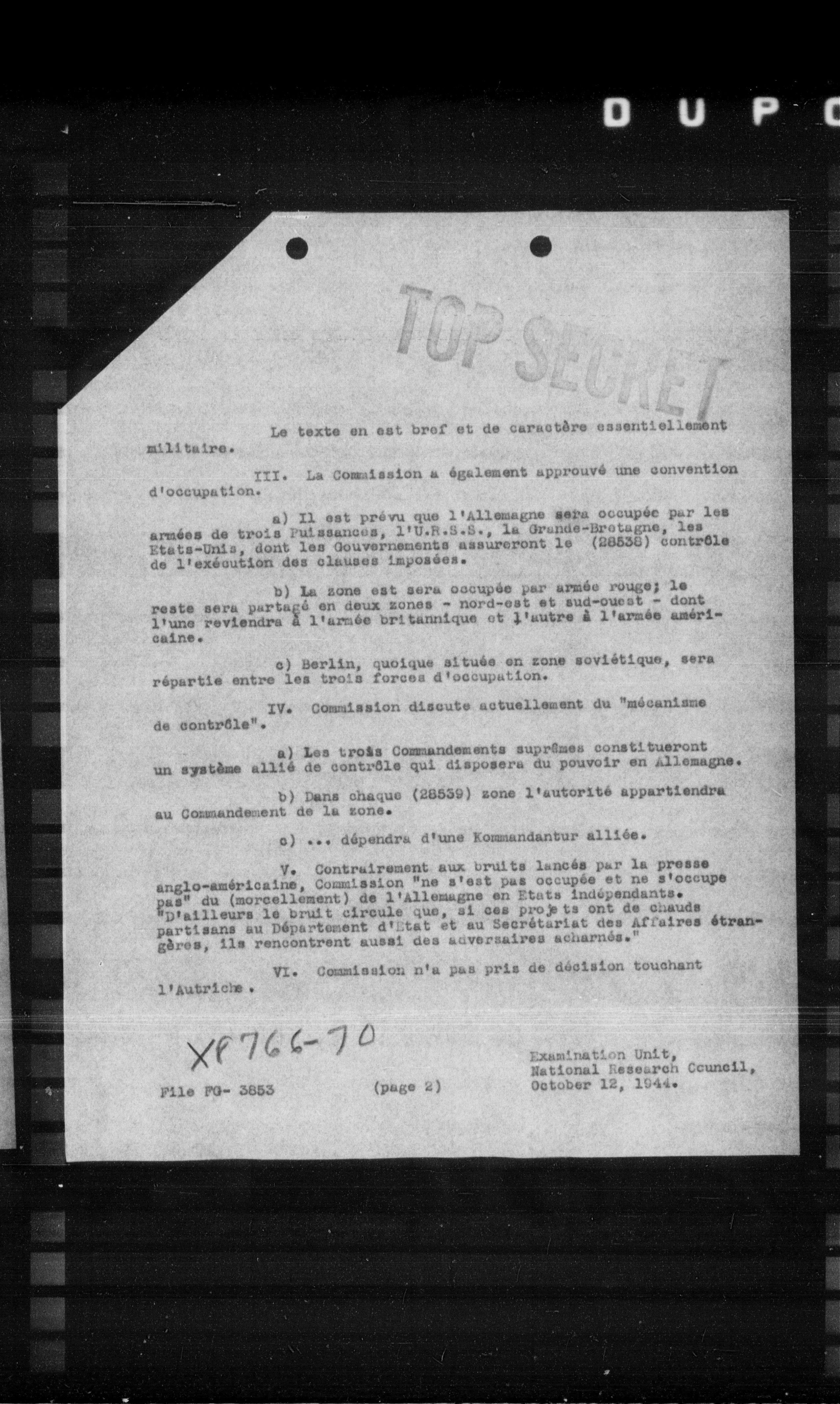 a) Il est prévu que l'Allemagne sera occupée par les armées de trois Puissances, I'U.R.S.S., la Grande-Bretagne, les Etats-Unis, dont les Gouvernements assureront le (28530) contrôle de l'exécution des clauses imposées.
