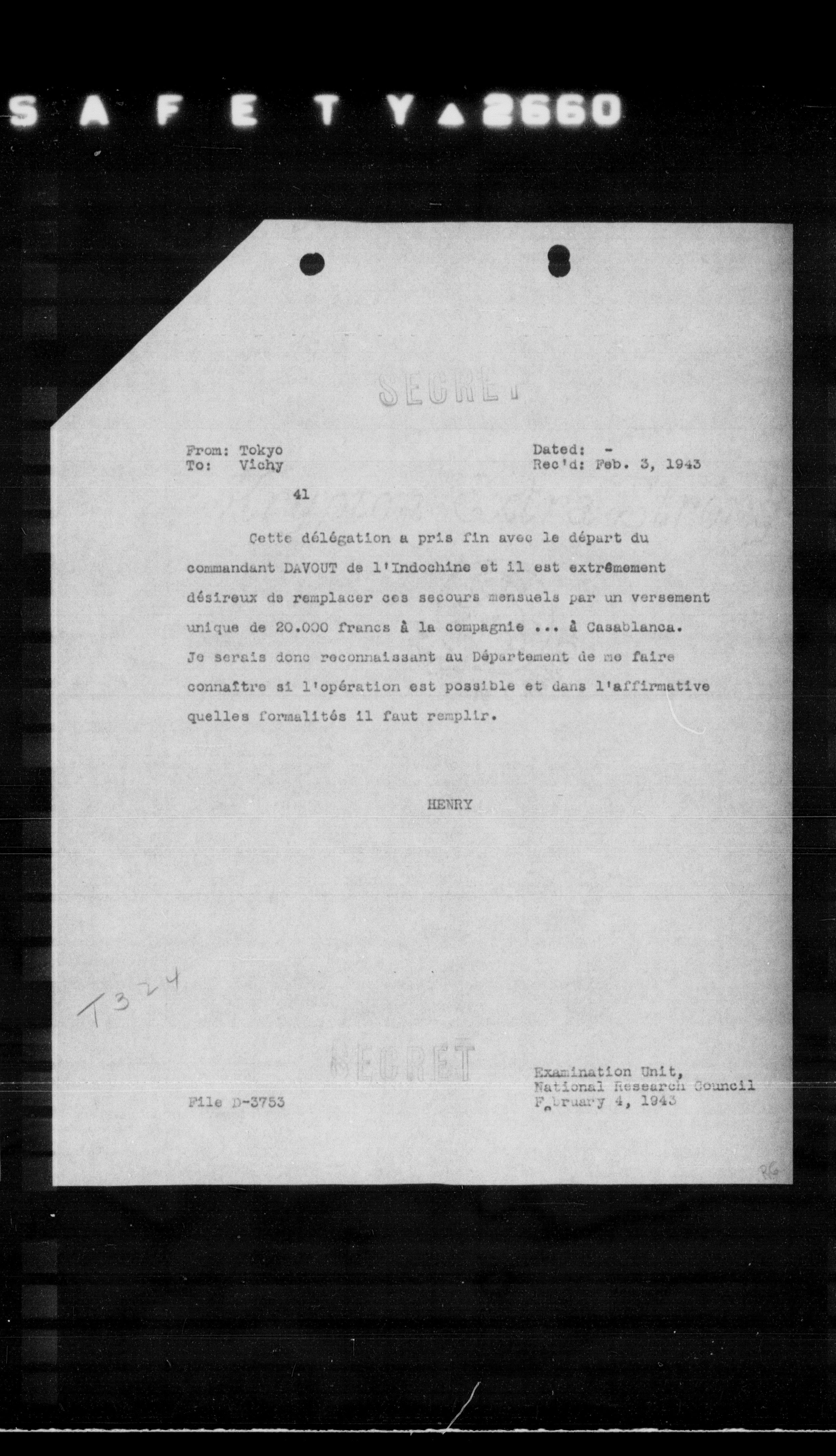 Cette délégation a pris fin avec le départ du commandant DAVOUT de l'Indochine et il est extrêmement désireux de remplacer ces secours mensuels par un versement unique de 20.000 francs à la compagnie ... à Casablanca. Je serais donc reconnaissant au Département de me faire connaitre si l'opération est possible et dans l'affirmative quelles formalités il faut remplir.
