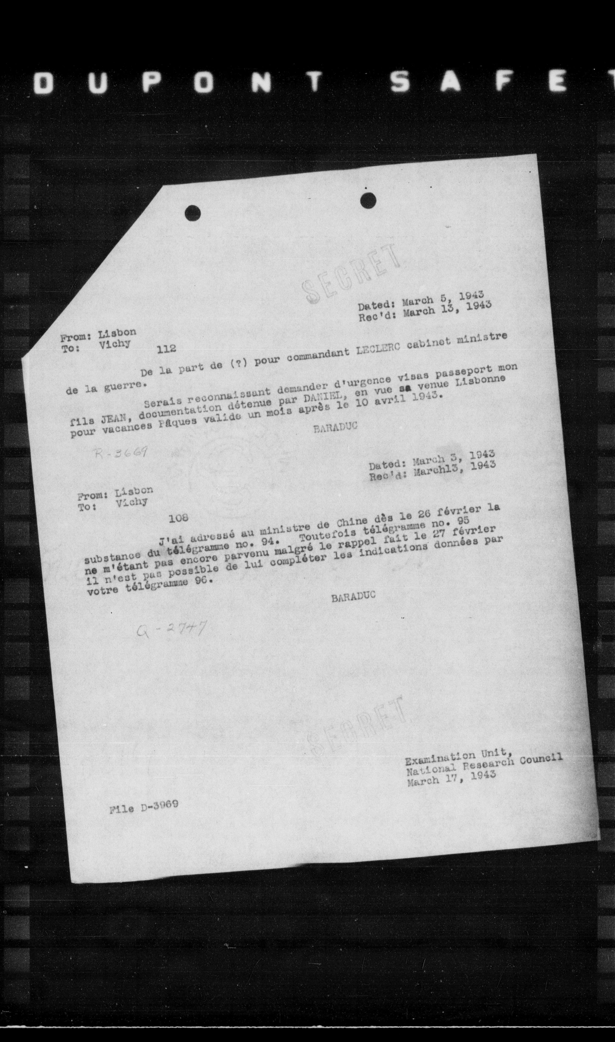 **From:** Lisbon **To:** Vichy **Dated:** March 5, 1943 **Rec'd:** March 15, 1943