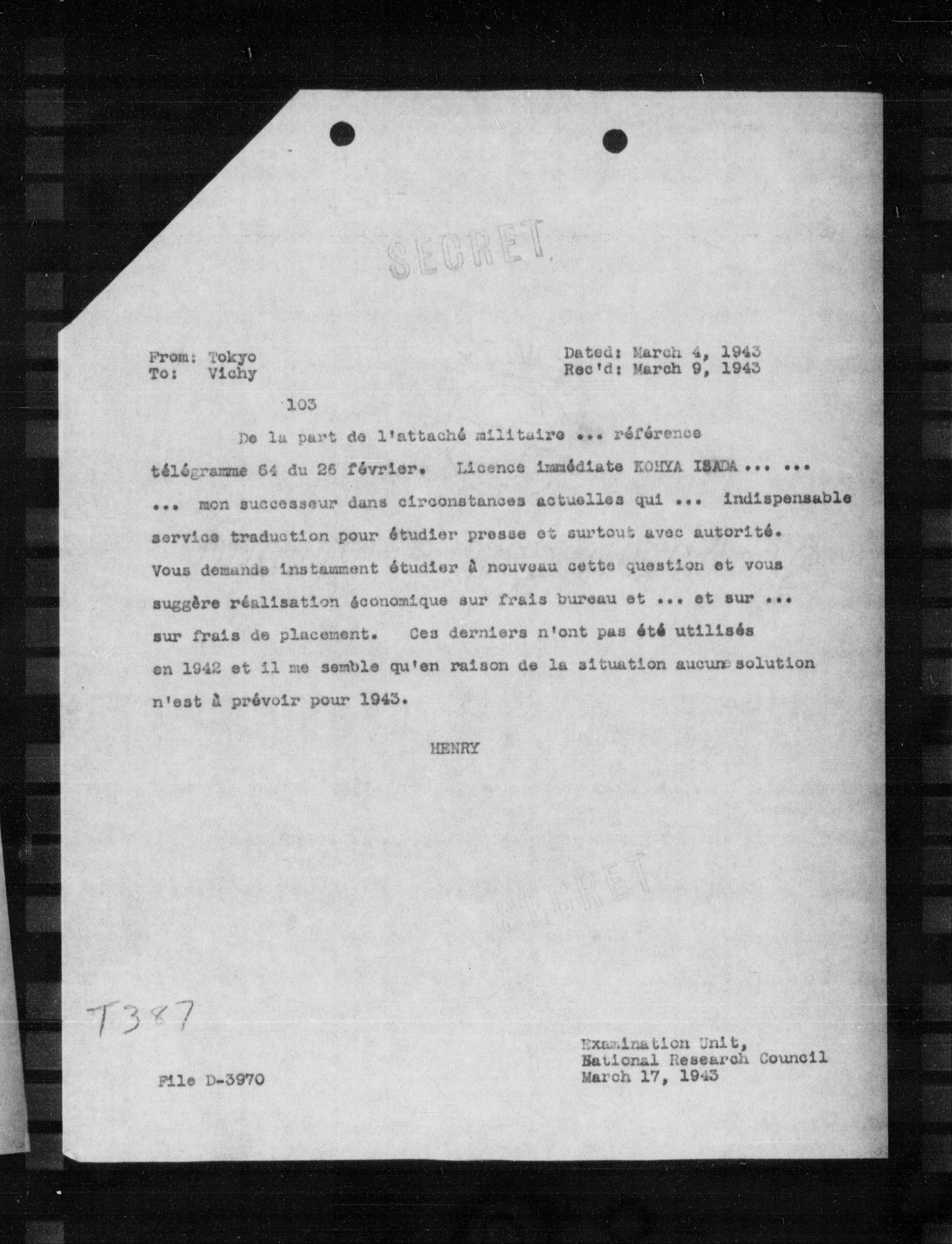 télégramme 64 du 26 février. Licence immédiate KOHYA ISADA ... ... ... ... ...