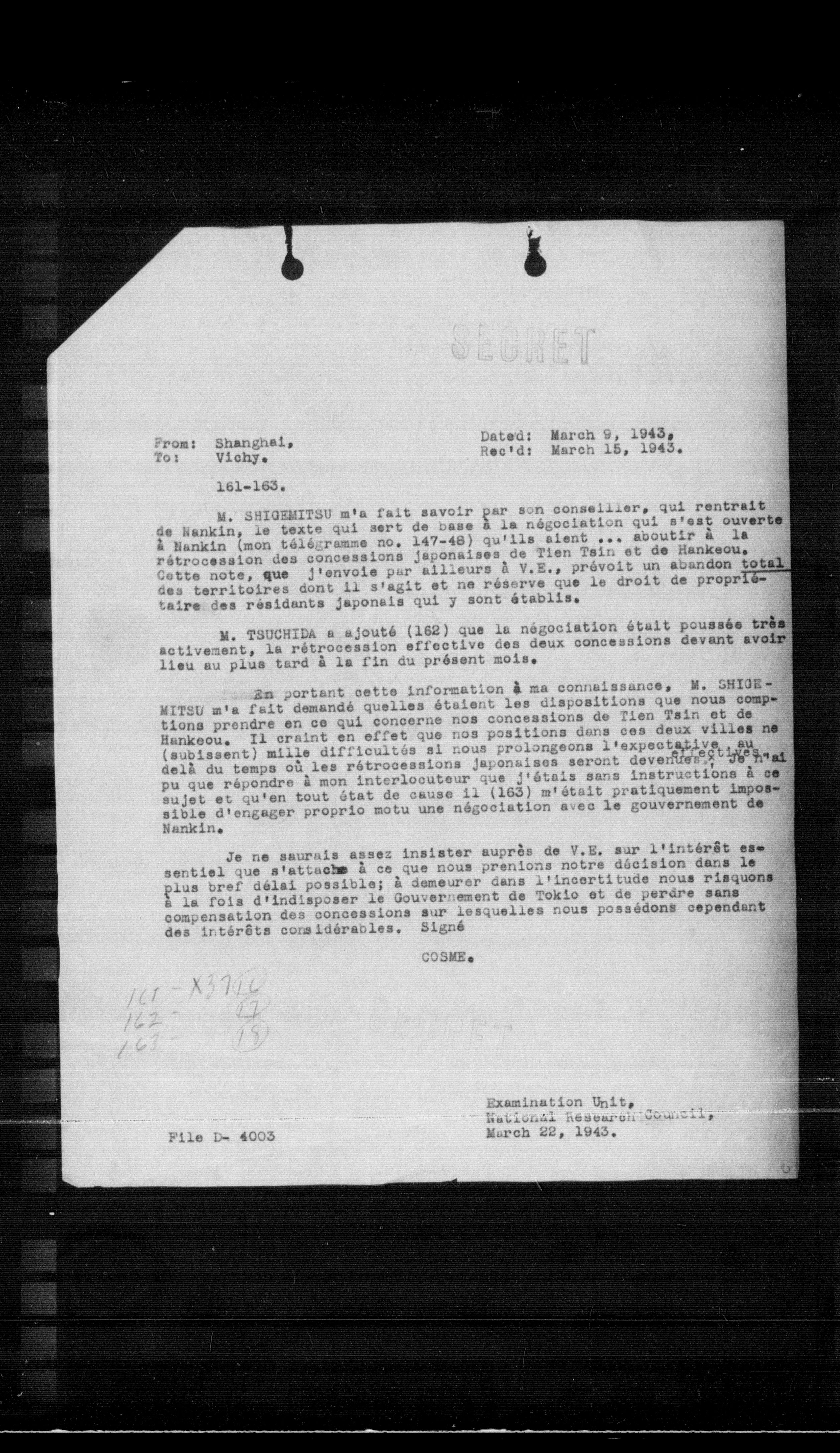 - From: Shanghai, Date: March 9, 1943, To: Vichy, Rec'd: March 15, 1943.