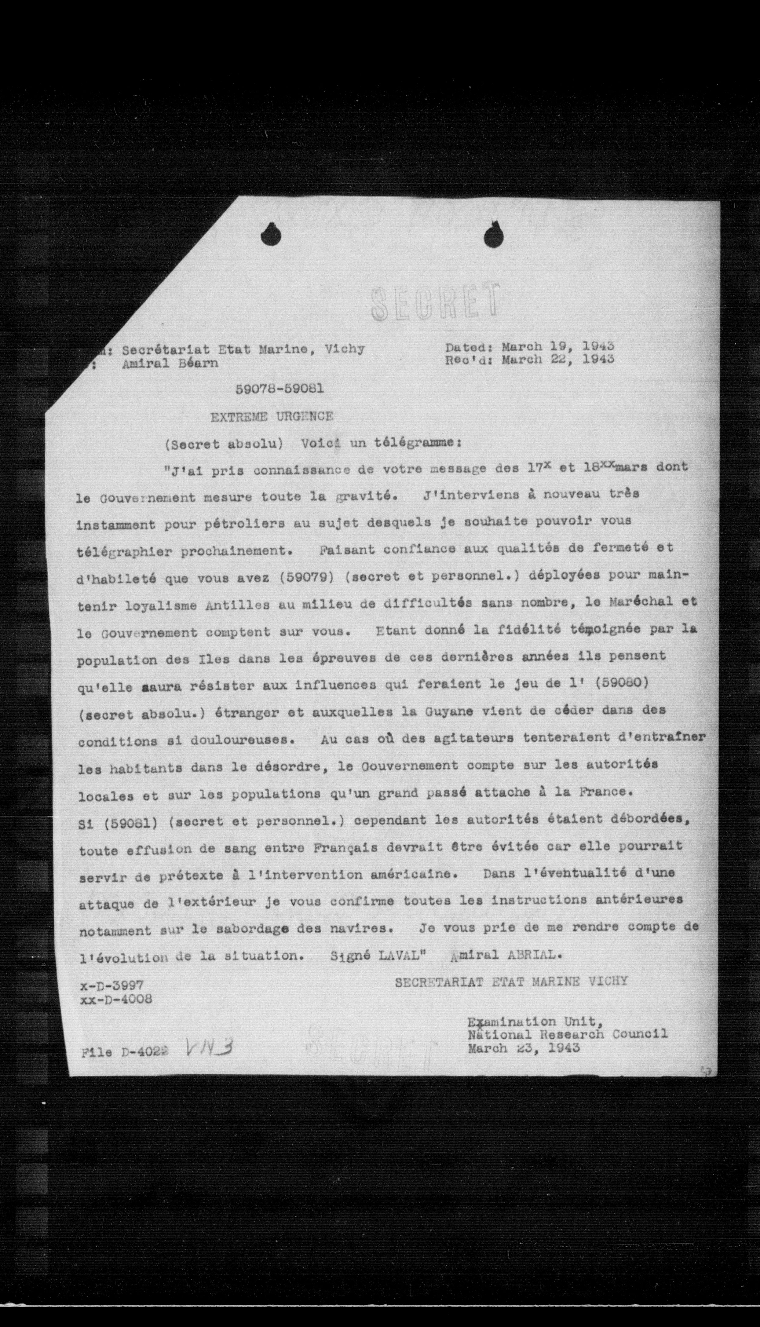 "J'ai pris connaissance de votre message des $17^{x}$ et $18^{x z}$ mars dont le Gouvernement mesure toute la gravité. J'interviens à nouveau très instamment pour pétroliers au sujet desquels je souhaite pouvoir vous télégraphier prochainement. Faisant confiance aux qualités de fermeté et d'habileté que vous avez (59079) (secret et personnel.) déployées pour maintenir loyalisme Antilles au milieu de difficultés sans nombre, le Maréchal et le Gouvernement comptent sur vous. Etant donné la fidélité témoignée par la population des îles dans les épreuves de ces dernières années ils pensent qu'elle saura résister aux influences qui feraient le jeu de l' (59080) (secret absolu.) étranger et auxquelles la Guyane vient de céder dans des conditions si douloureuses. Au cas oi des agitateurs tenteraient d'entraîner les habitants dans le désordre, le Gouvernement compte sur les autorités locales et sur les populations qu'un grand passé attache à la France. Si (59081) (secret et personnel.) cependant les autorités étaient débordées, toute effusion de sang entre Français devrait être évitée car elle pourrait servir de prétexte à l'intervention américaine. Dans l'éventualité d'une attaque de l'extérieur je vous confirme toutes les instructions antérieures notamment sur le sabordage des navires. Je vous prie de me rendre compte de l'évolution de la situation. Signé LAVAL" amiral ABRIAL.
