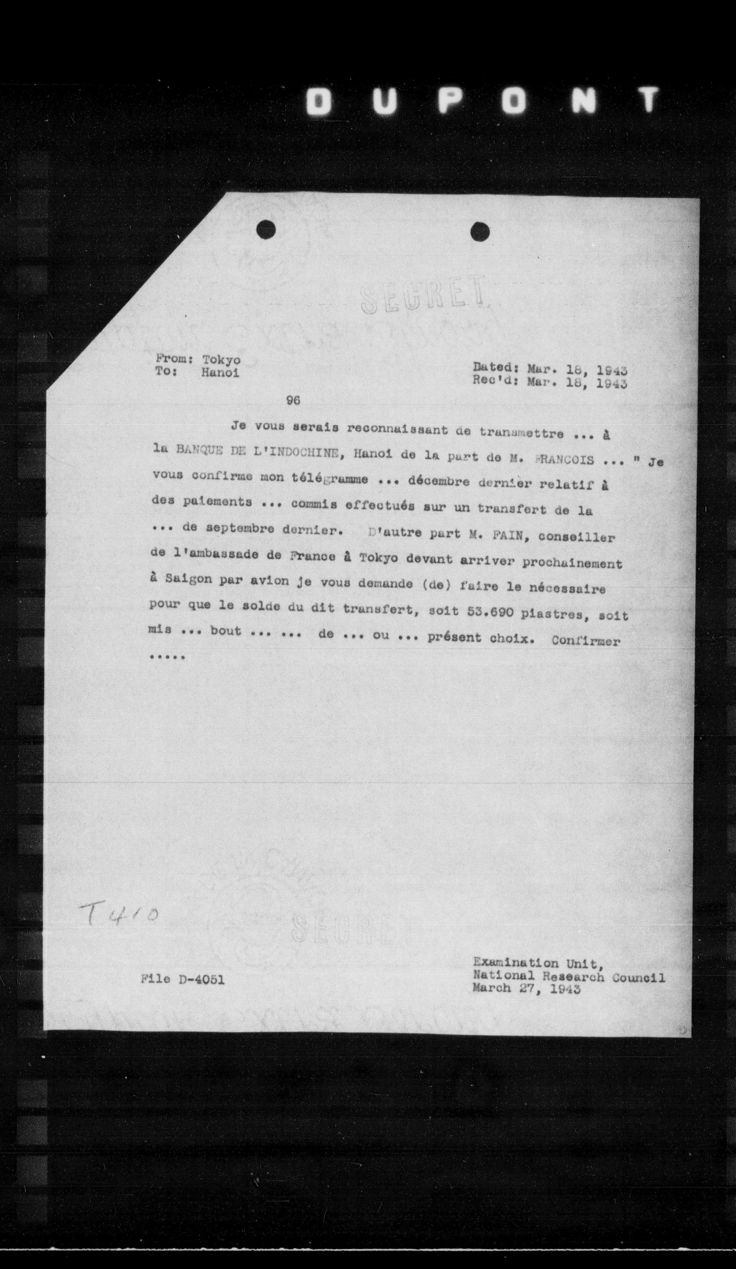 la BANGUE DE L'INDOCHINE, Hanoi de la part de M. FRANCOIS ... " Je vous confirme mon télégrame ... décembre dernier relatif à des paiements ... commis effectués sur un transfert de la ... de septembre dernier. D'autre part M. PAIN, conseiller de l'ambassade de France à Tokyo devant arriver prochainement à Saigon par avion je vous demande (de) faire le nécessaire pour que le solde du dit transfert, soit 53.690 plastres, soit mis ... bout ... ... de ... ou ... présent choix. Confirmer