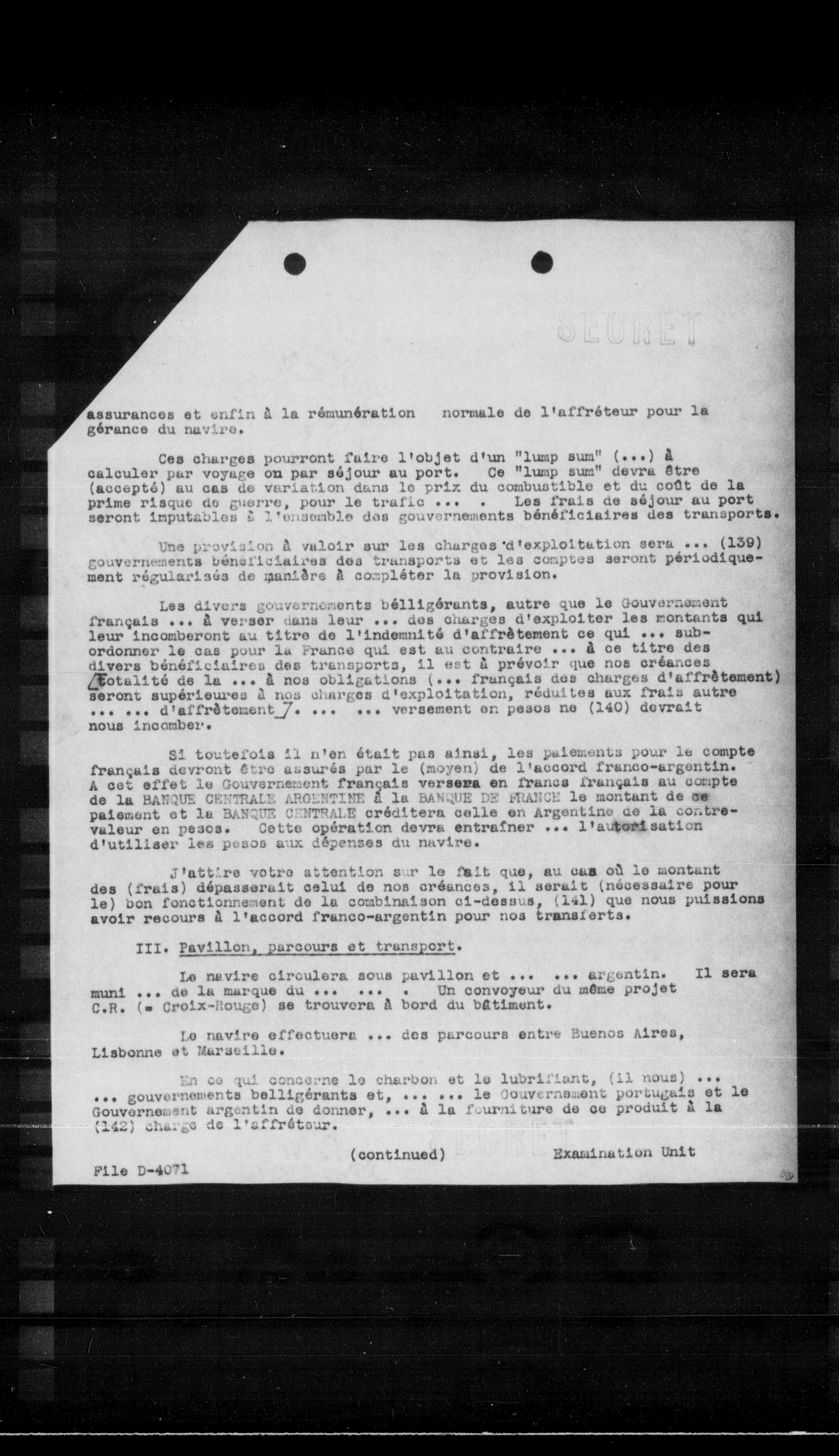 Si toutefois il n'en était pas ainsi, les paiements pour le compte français devront être assurés par le (moyen) de l'accord franco-argentin. A cet effet le Gouvernement français versera en francs français au compte de la HANGUE CENTRALE ABOUSTIER E la HANGUE DE FRANCE le montant de se paiement et la HANGUE CENTRALE créditera celle en Argentine de la contrevaleur en pesos. Cette opération devra entraîner ... l'autorisation d'utiliser les pesos aux dépenses du navire.
