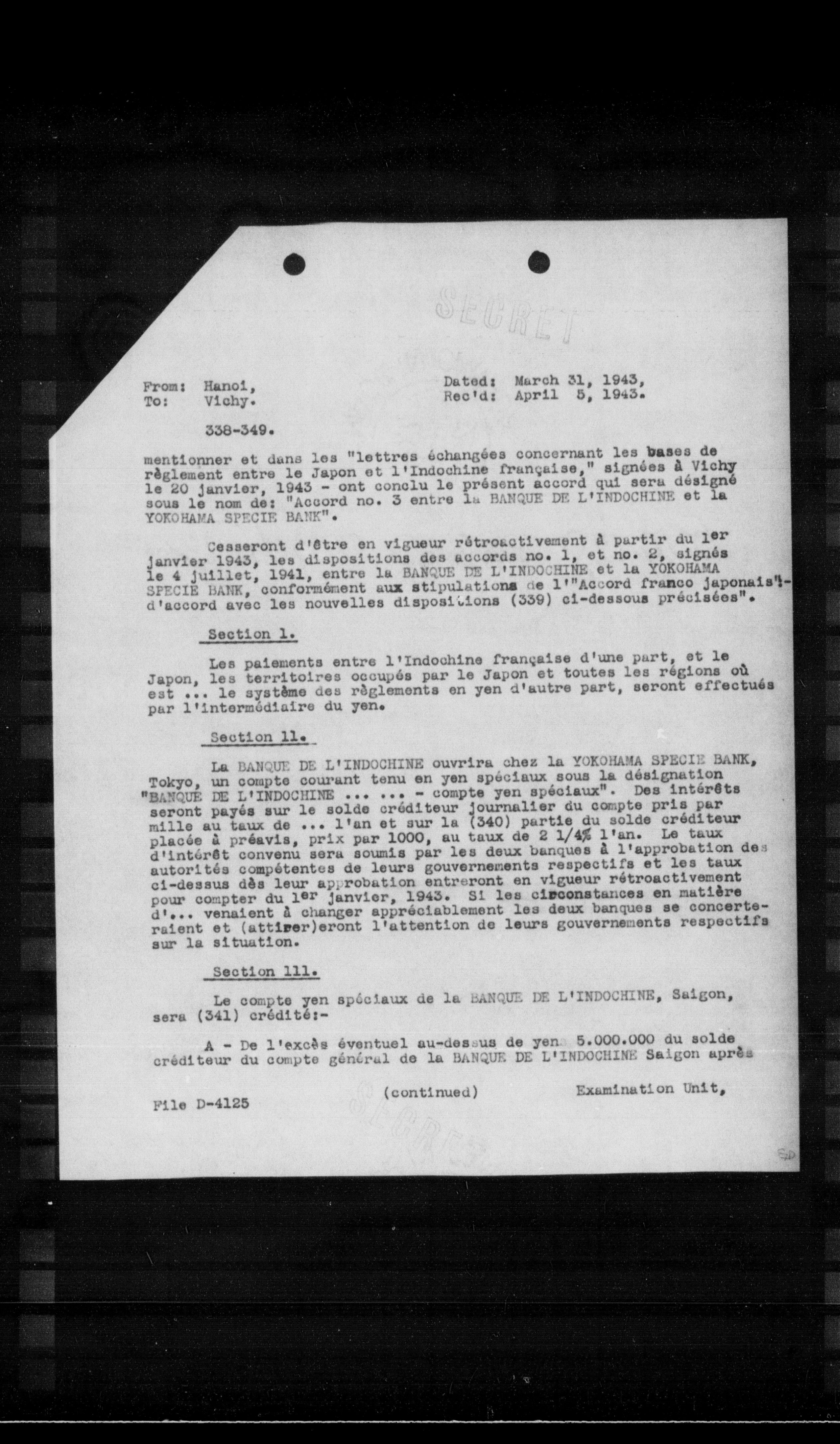 mentionner et dans les "lettres échangées concernant les bases de règlement entre le Japon et l'Indochine française," signées à Vichy le 20 janvier, 1943 - ont conclu le présent accord qui sera désigné sous le nom de: "Accord no. 3 entre la BANQUE DE L'INDOCHINE et la YOKOHAMA SPECIE BANK".