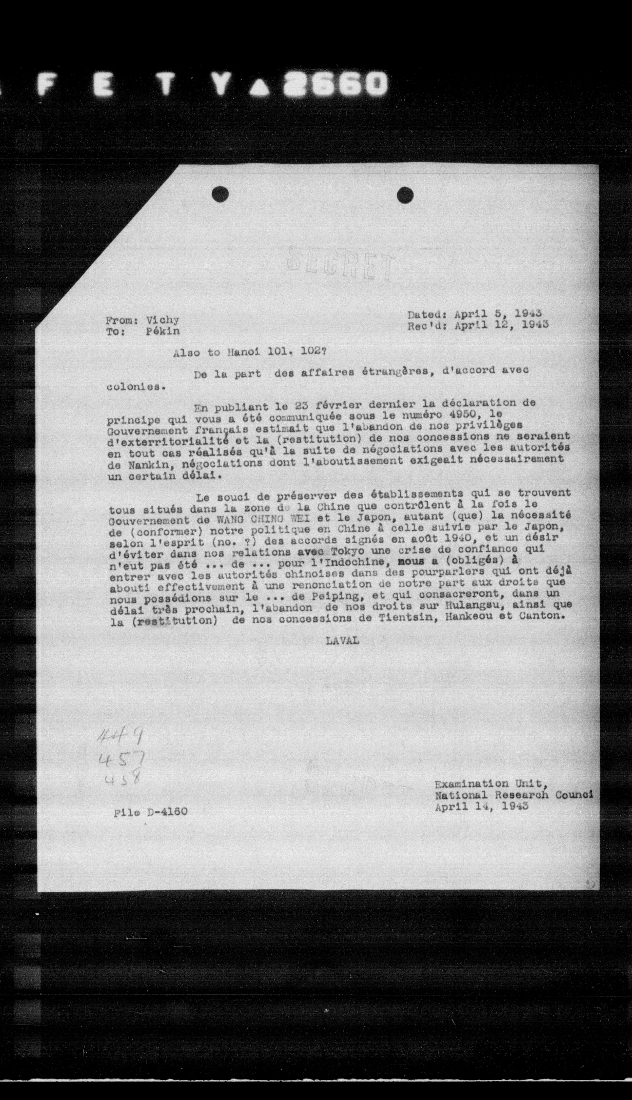 Le souci de préserver des établissements qui se trouvent tous situés dans la zone de la Chine que contrôlent à la fois le Gouvernement de NANG CHING WEI et le Japon, autant (que) la nécessité de (conformer) notre politique en Chine à celle suivie par le Japon, selon l'esprit (no. ?) des accords signés en août 1940, et un désir d'éviter dans nos relations avec Tokyo une crise de confiance qui n'eut pas été ... de ... pour l'Indochine, mous a (obligés) à entrer avec les autorités chinoises dans des pourparlors qui ont déjà abouti effectivement à une renonciation de notre part aux droits que nous possédions sur le ... de Feiping, et qui consacreront, dans un délai très prochain, l'abandon de nos droits sur Hulangsu, ainsi que la (restitution) de nos concessions de Tientsin, Hankou et Canton.