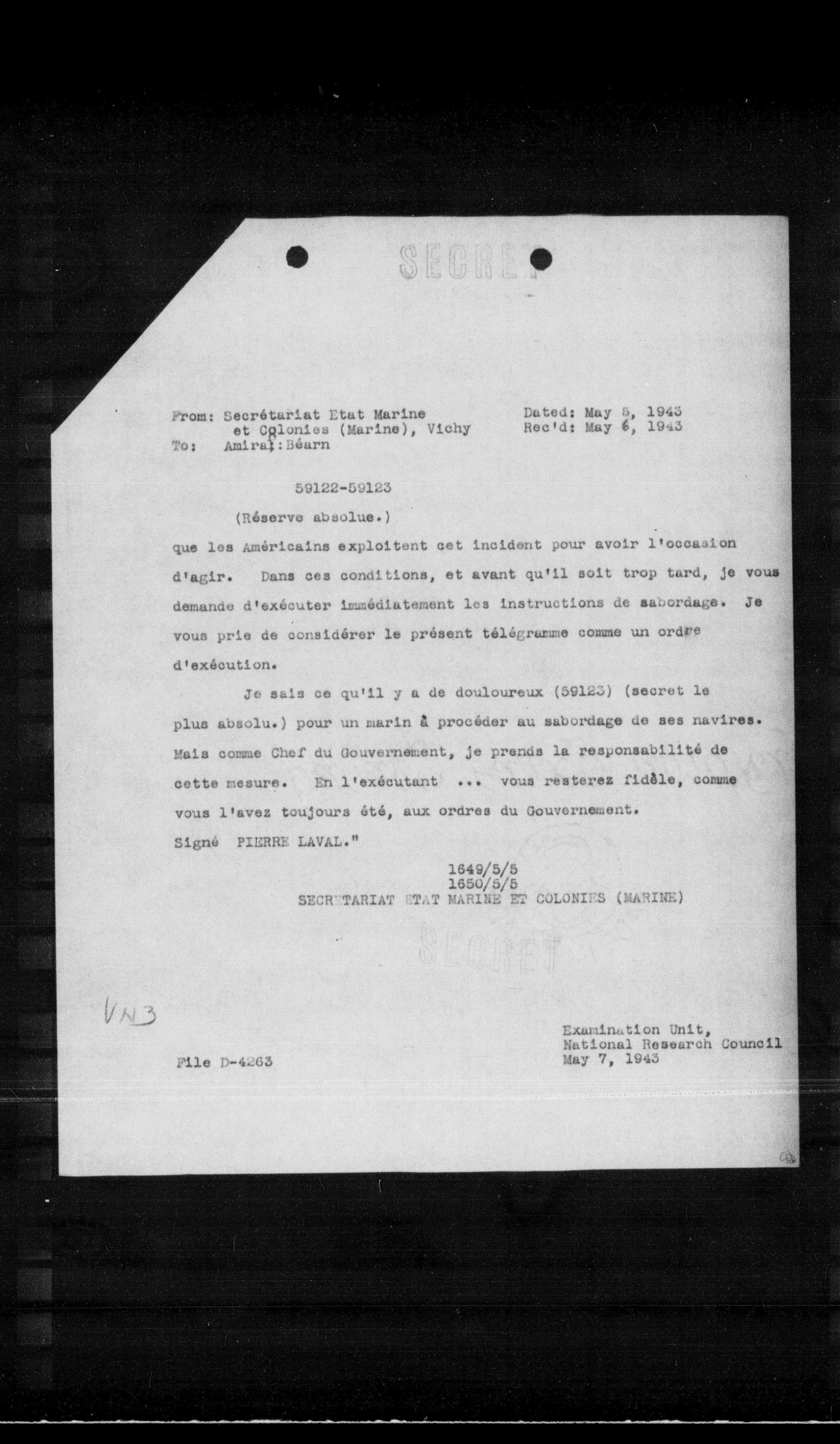 Je sais ce qu'il y a de douloureux (59123) (secret le plus absolu.) pour un marin à procéder au sabordage de ses navires. Mais comme Chef du Gouvernement, je prends la responsabilité de cette mesure. En l'exécutant ... vous resterez fidèle, comme vous l'avez toujours été, aux ordres du Gouvernement.