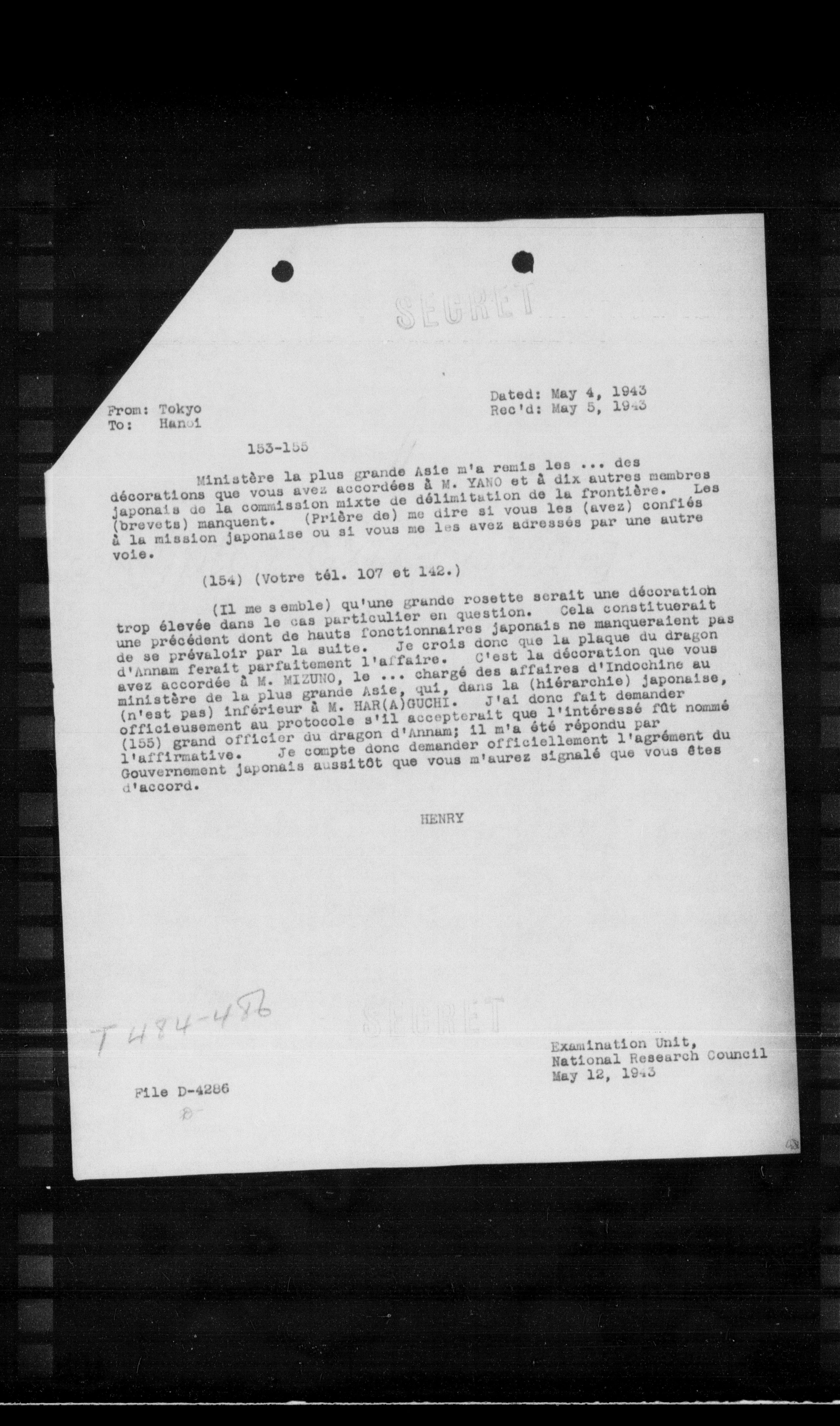 (Il me semble) qu'une grande rosette serait une décoration trop élevée dans le cas particulier en question. Cela constituerait une précédent dont de hauts fonctionnaires japonais ne manqueraient pas de se prévaloir par la suite. Je crois donc que la plaque du dragon d'innam ferait parfaitement l'affaire. C'est la décoration que vous avez accordée a M. MIZURO, le ... chargé des affaires d'Indochine au ministère de la plus grande Asie, qui, dans la (hiérarchie) japonaise, (n'est pas) inférieur a M. HAR(A)OUCHI. J'ai donc fait demander officieusement au protocole s'il accepterait que l'intéressé fût nommé (155) grand officier du dragon d'innam; il m'a été répondu par l'affirmative. Je compte donc demander officiellement l'agrément du Gouvernement japonais aussitôt que vous m'aurez signalé que vous êtes d'accord.