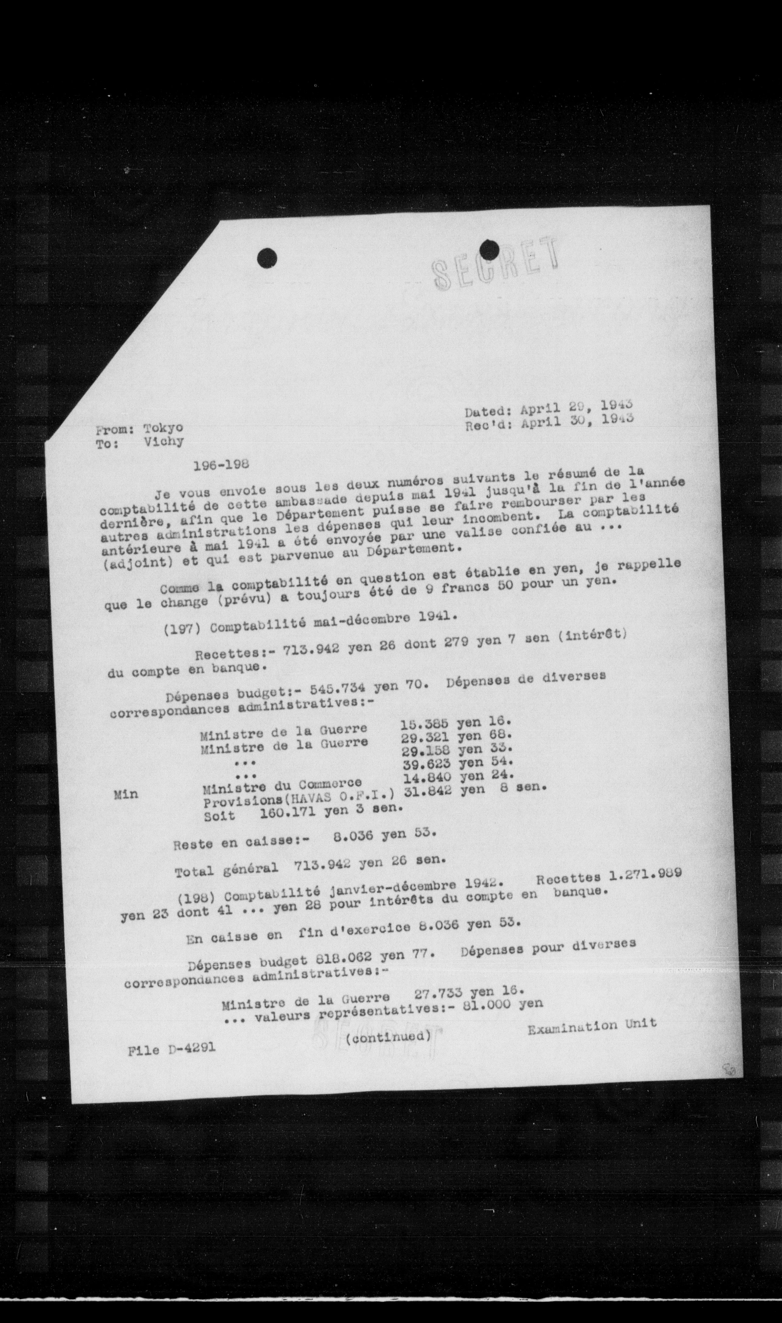 (198) Comptabilité janvier-décembre 1942. Recettes 1.271 .989 yen 23 dont $41 \ldots$ yen 28 pour intérêts du compte en banque.