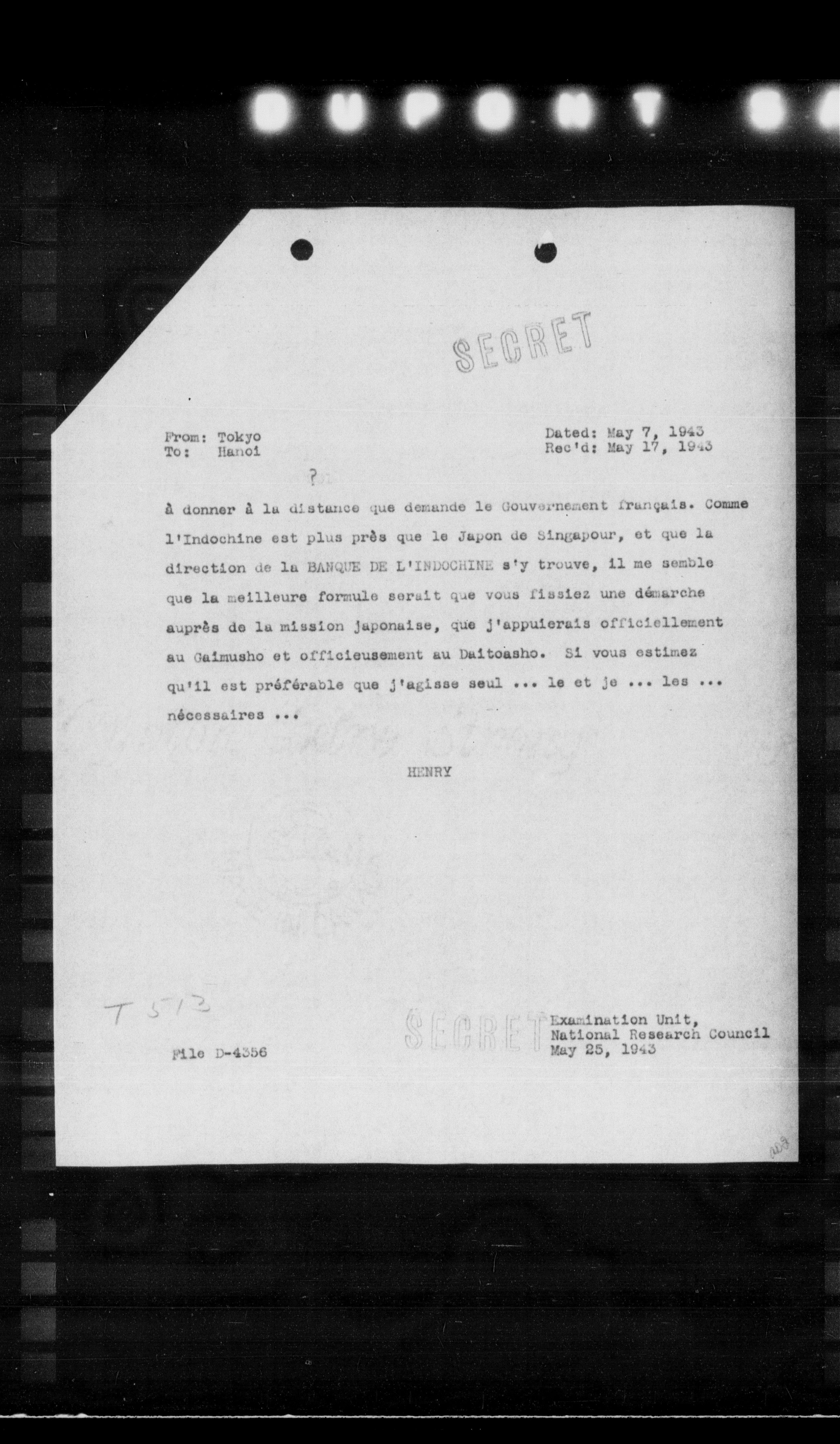 a donner a la distance que demande le Gouvernement frangais. Comme l'Indochine est plus près que le Japon de singapour, et que la direction de la HANQUE DE L'INDOCHINE s'y trouve, il me semble que la meilleure formule serait que vous fissiez une démarche auprès de la mission japonaise, que j'appuierais officiellement au Galmusho et officieusement au Daitoasho. Si vous estimez qu'il est préférable que j'agisse seul ... le et je ... les ... nécessaires ...
