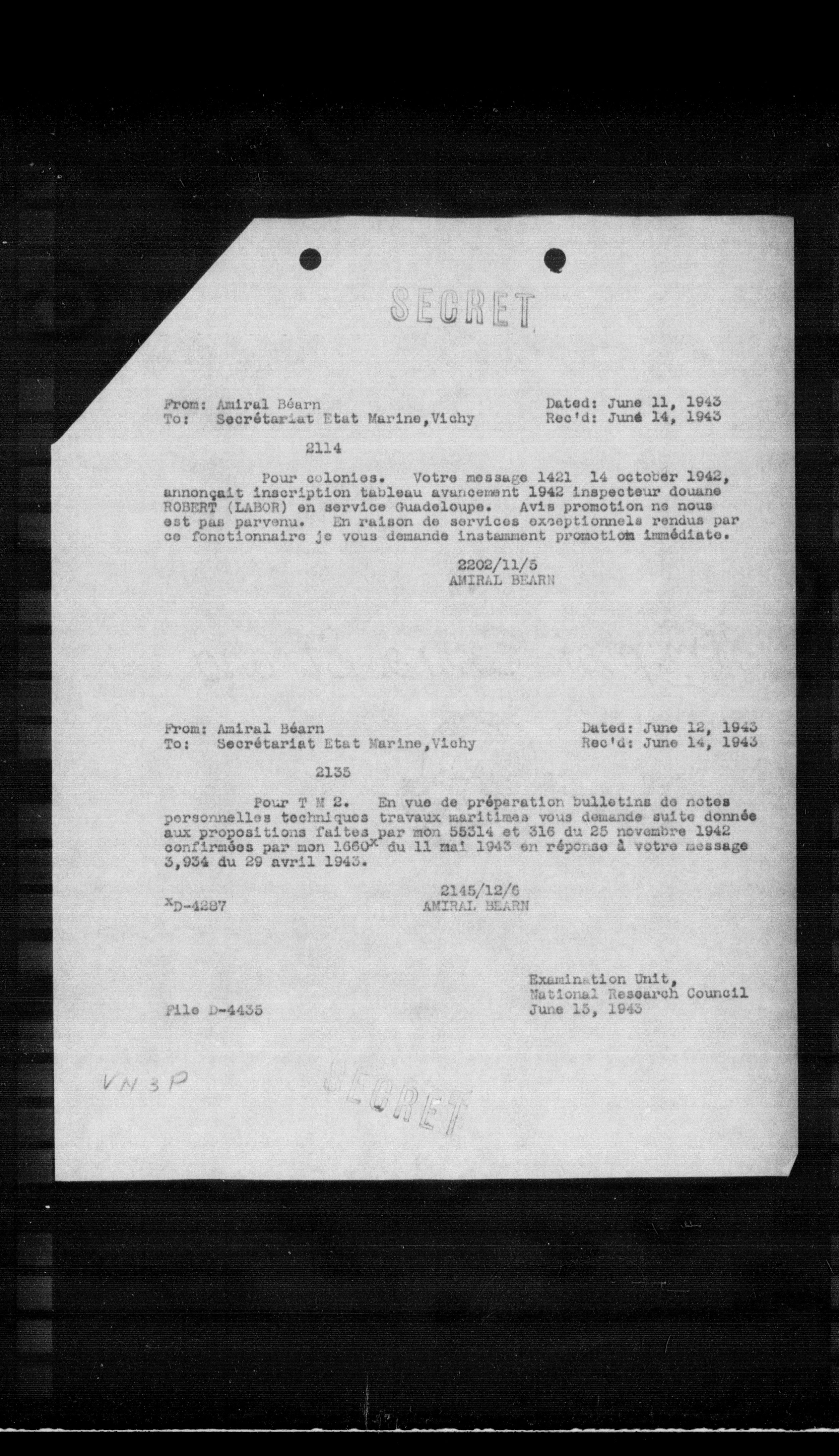 Pour T M E. En vue de préperation bulletins de notes personnelles techniques travaux maritimes vous demande suite donnée aux propositions faites par mon 58214 et 316 du 25 novembre 1942 confirmées par mon $1660^{2}$ du 11 mai 1943 en réponse à votre message 3,934 du 29 avril 1943.