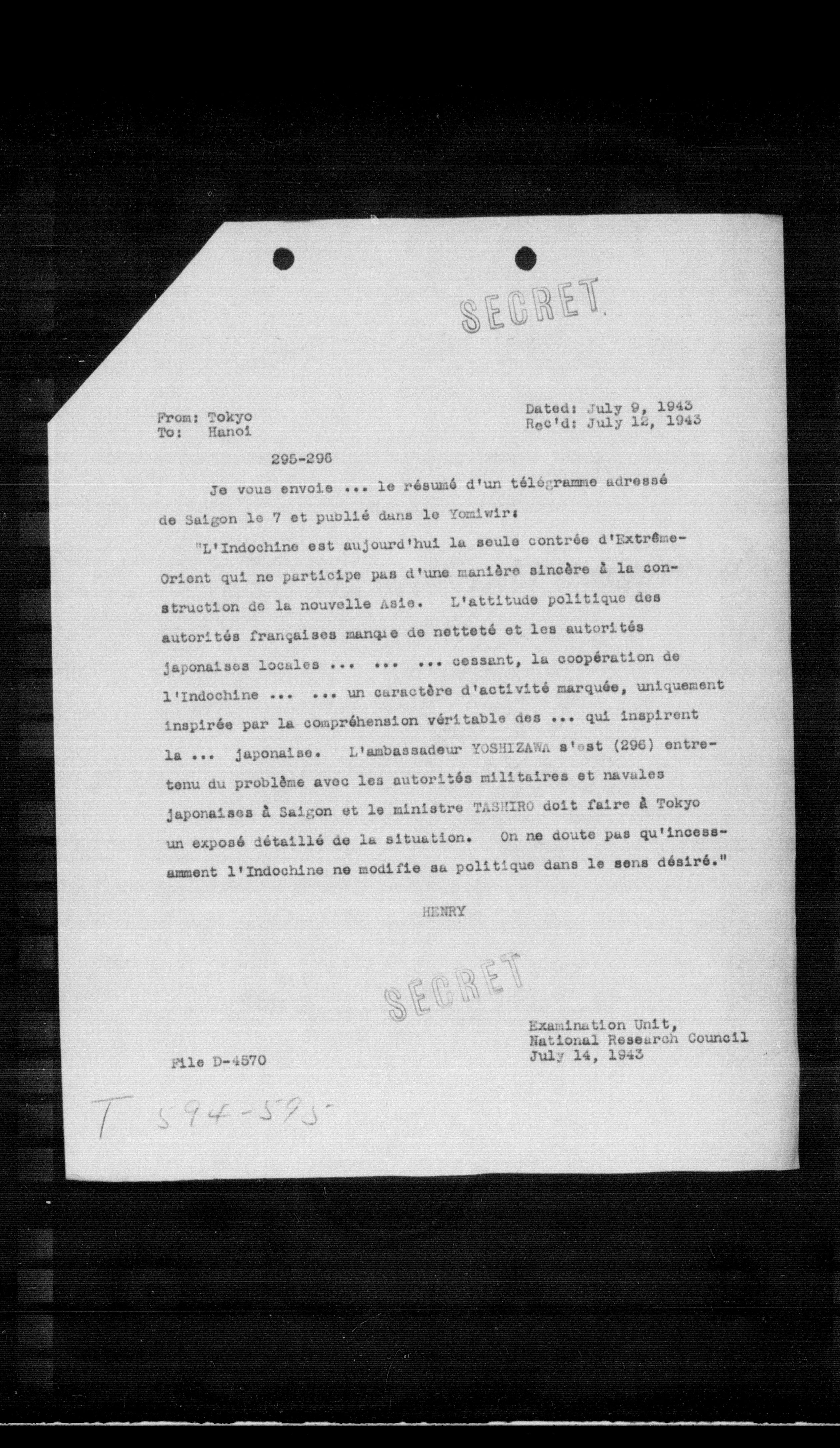 "L'Indochine est aujourd'hui la seule contrée d'ExtremeOrient qui ne participe pas d'une manière sincère à la construction de la nouvelle Asie. L'attitude politique des autorités frangaises manque de netteté et les autorités japonaises locales ... ...... cessant, la coopération de l'Indochine ... ... un caractère d'activité marquée, uniquement inspirée par la compréhension véritable des ... qui inspirent la ... Japonaise. L'ambassadeur YOSHIZAWA s'est (296) entretenu du problème avec les autorités militaires et navales japonaises a Saigon et le ministre TASHIRO doit faire a Tokyo un exposé détaillé de la situation. On ne doute pas qu'incessamont l'Indochine ne modifie sa politique dans le sens désiré."