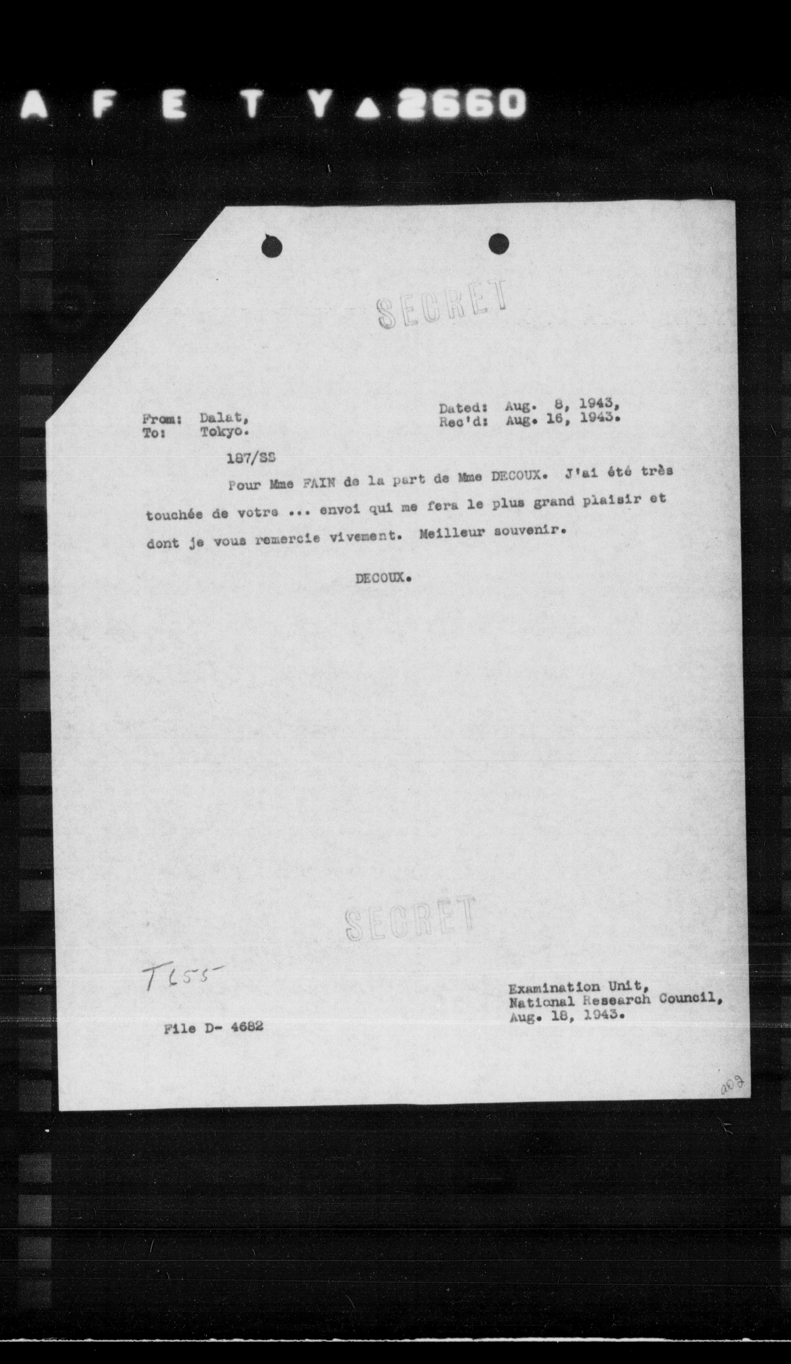 Pour Mme FAIR de la part de Mme DECOUX. J'ai été très touchée de votre ... envoi qui me fera le plus grand plaisir et dont je vous remercie vivement. Meilleur souvenir.