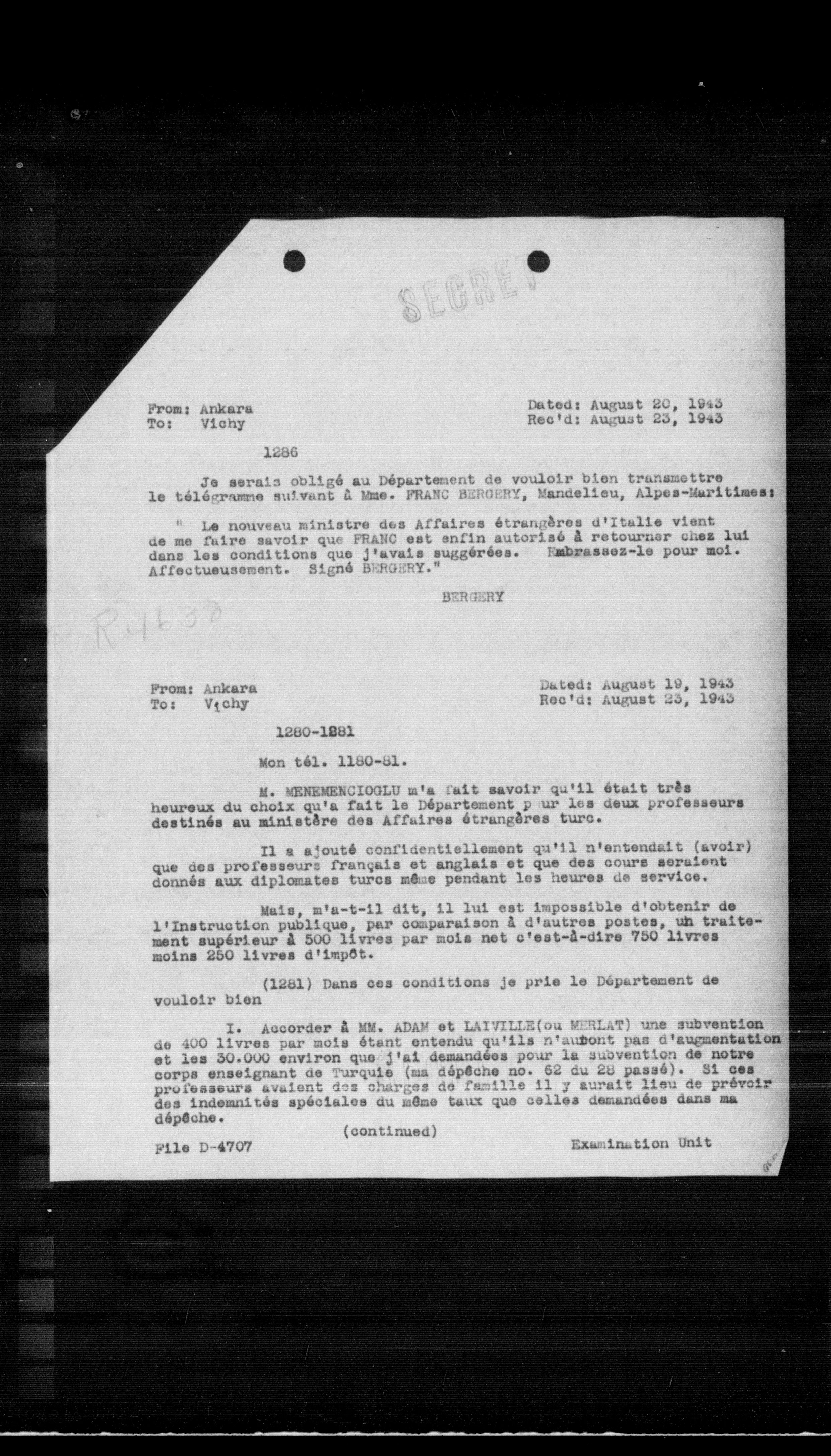 - Le nouveau ministre des Affaires étrangères d'Italie vient de me faire savoir que FRANC est enfin autorisé à retourner chez lui dans les conditions que j'avais suggérées. Embrassez-le pour moi. Affectueusement. Signé BERGENY."