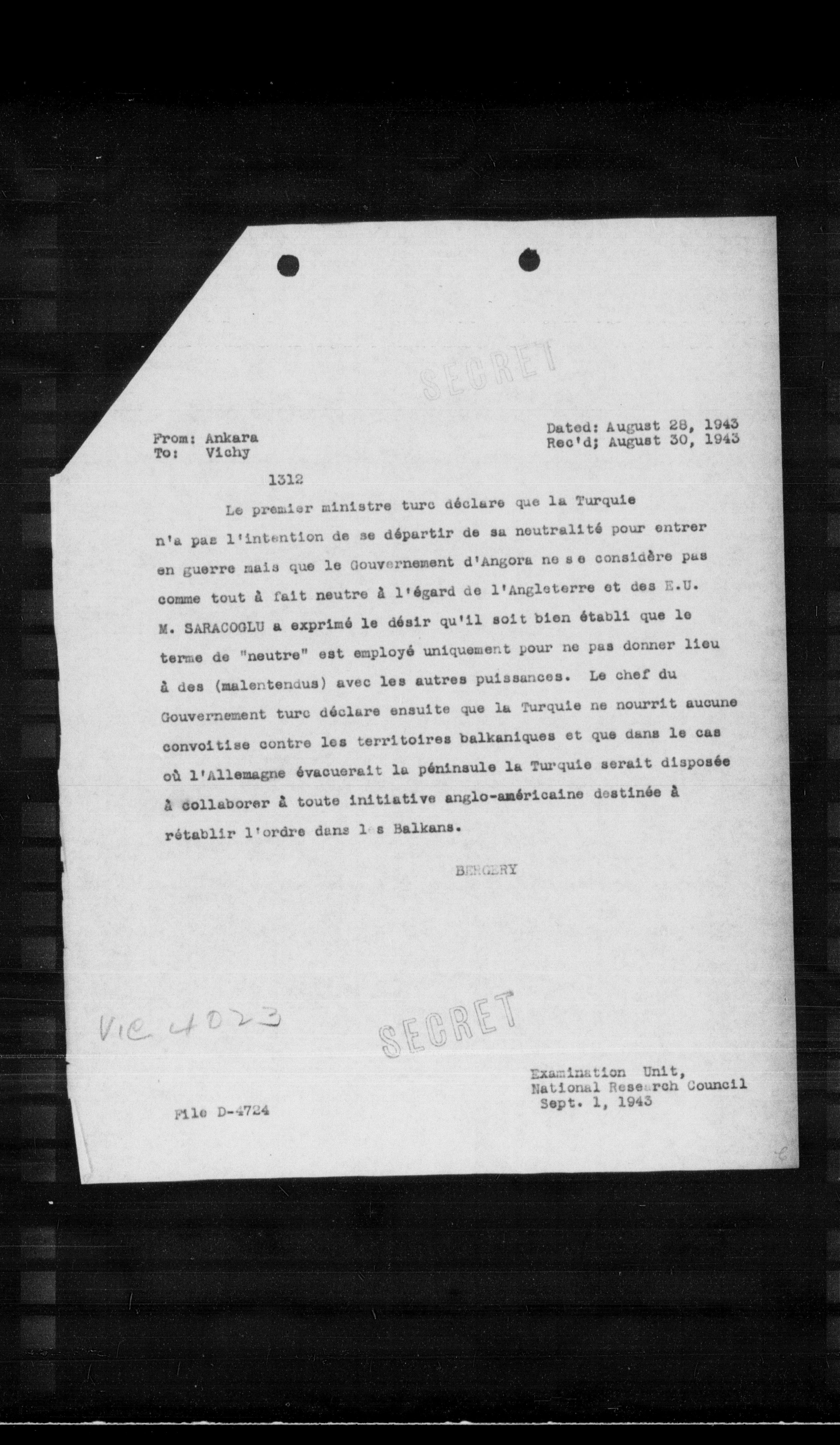 Le premier ministre turc déclare que la Turquie n'a pas l'intention de se départir de sa neutralité pour entrer en guerre mais que le Gouvernement d'Angora ne se considère pas comme tout à fait neutre à l'égard de l'Angleterre et des E.U. M. SARACOGLU a exprimé le désir qu'il soit bien établi que le terme de "neutre" est employé uniquement pour ne pas donner lieu à des (malentendus) avec les autres puissances. Le chef du Gouvernement turc déclare ensuite que la Turquie ne nourrit aucune convoitise contre les territoires balkaniques et que dans le cas oú l'Allemagne évacuerait la péninsule la Turquie serait disposée à collaborer à toute initiative anglo-américaine destinée à rétablir l'ordre dans l's Balkans.