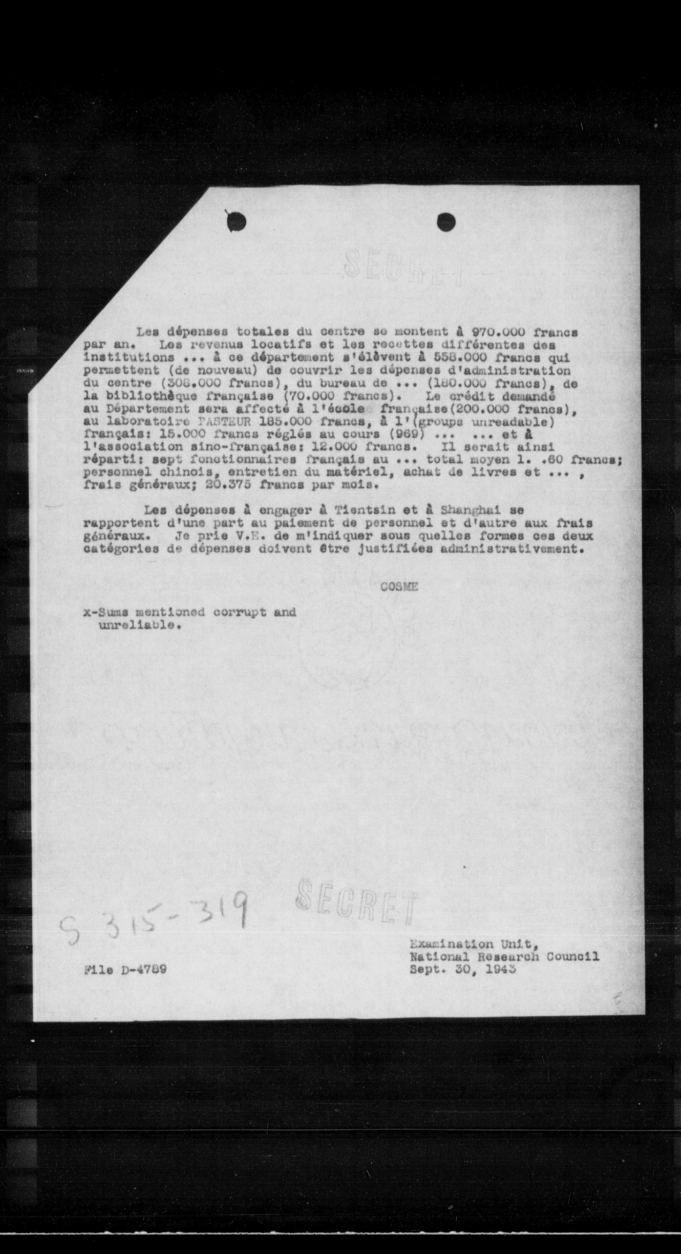 - Les dépenses totales du centre se montent à 970.000 francs par an. Les revenus locatifs et les recettes différentes des institutions ... à ce département s'élèvent à 550.000 francs qui permettent (de nouveau) de couvrir les dépenses d'administration du centre (300.000 francs), du bureau de ... (180.000 francs), de la bibliothèque française (70.000 francs). Le crédit demandé au Département sera affecté à l'école française (200.000 francs), au laboratoire FASTEUR 185.000 francs, à l' (groupe unreadable) français: 15.000 francs réglés au cours (969) ... ... et à l'association sino-française: 12.000 francs. Il serait ainsi réparti: sept fonctionnaires français au ... total moyen 1. .60 francs; personnel chinois, entretien du matériel, achat de livres et ... , frais généraux; 20.375 francs par mois.