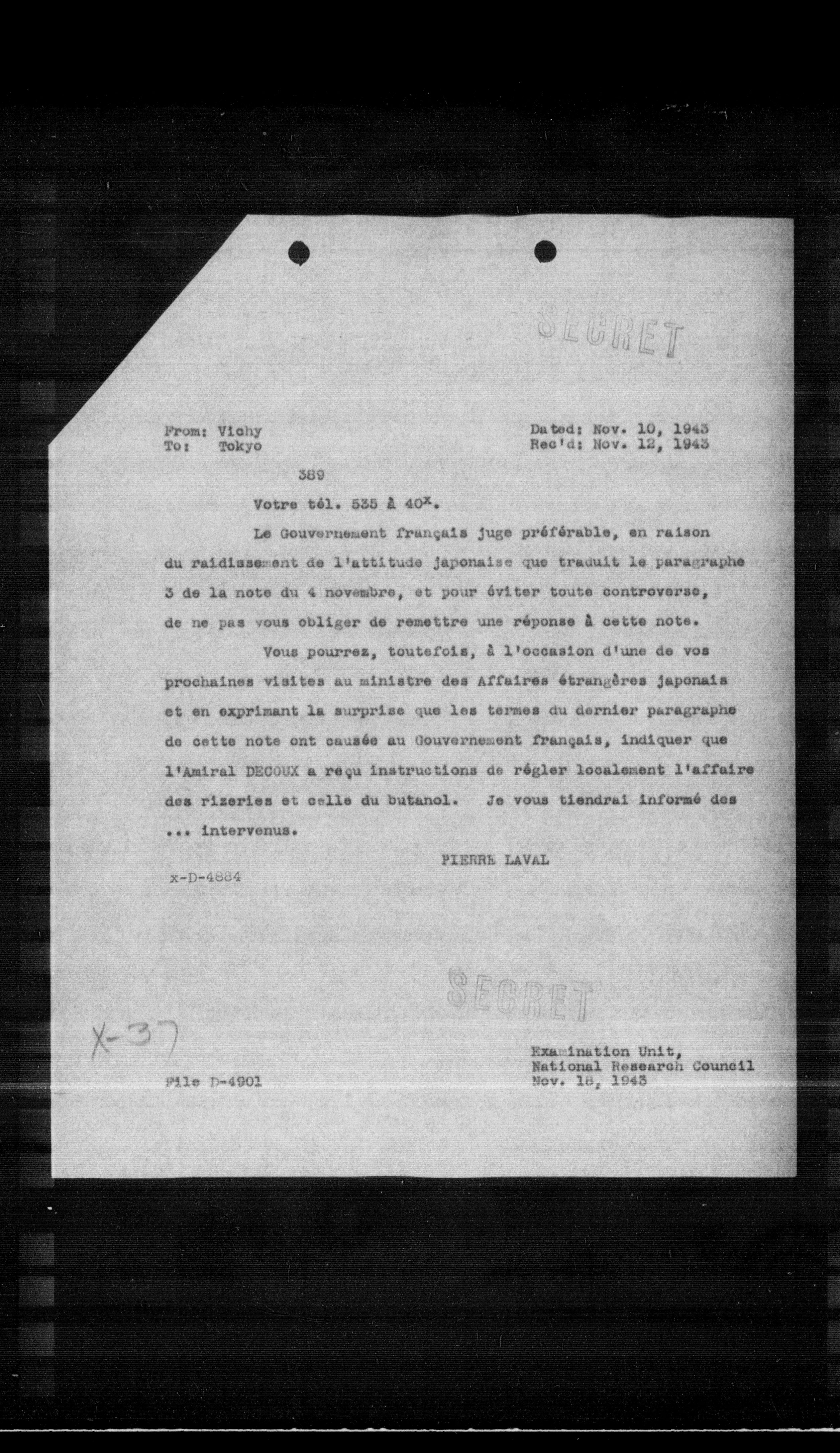 Vous pourrez, toutefois, a l'occasion d'une de vos prochaines visites au ministre des Affaires étrangères japonais et en exprimant la surprise que les termes du dernier paragraphe de cette note ont causé au Gouvernement français, indiquer que l'amiral DECOUX a reçu instructions de régler localement l'affaire des rizeries et celle du butanol. Je vous tiendral informé des ... Intervenus.