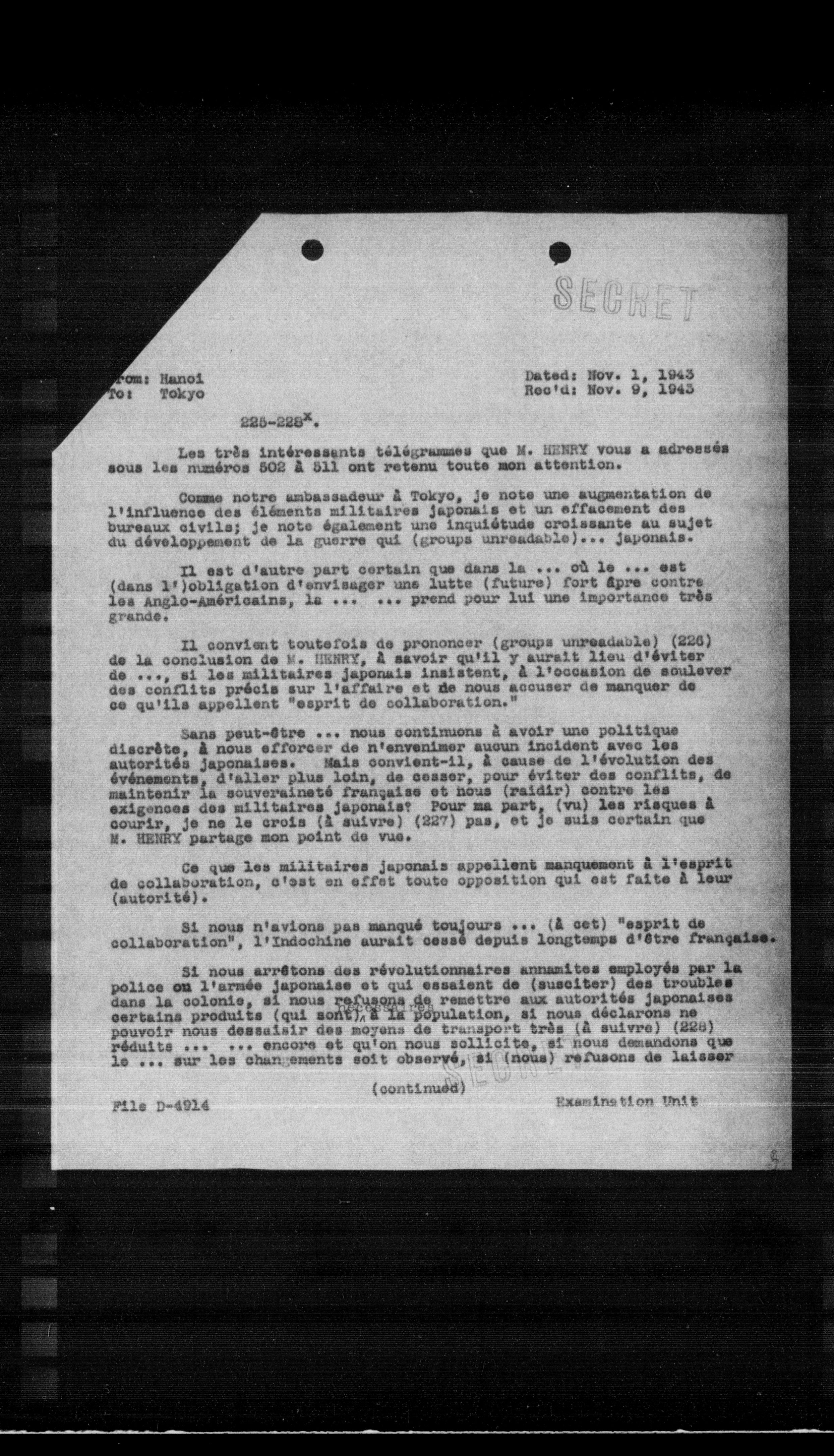 Sans peut-être ... nous continuons à avoir une politique discrète, à nous efforcer de n'envenimer aucun incident avec les autorités japonaises. Mais convient-il, à cause de l'évolution des événements, d'aller plus loin, de cesser, pour éviter des conflits, de maintenir la souveraineté française et nous (raidir) contre les exigences des militaires japonais? Pour ma part, (vu) les risques à courir, je ne le crois (à suivre) (227) pas, et je suis certain que M. HENRY partage mon point de vue.