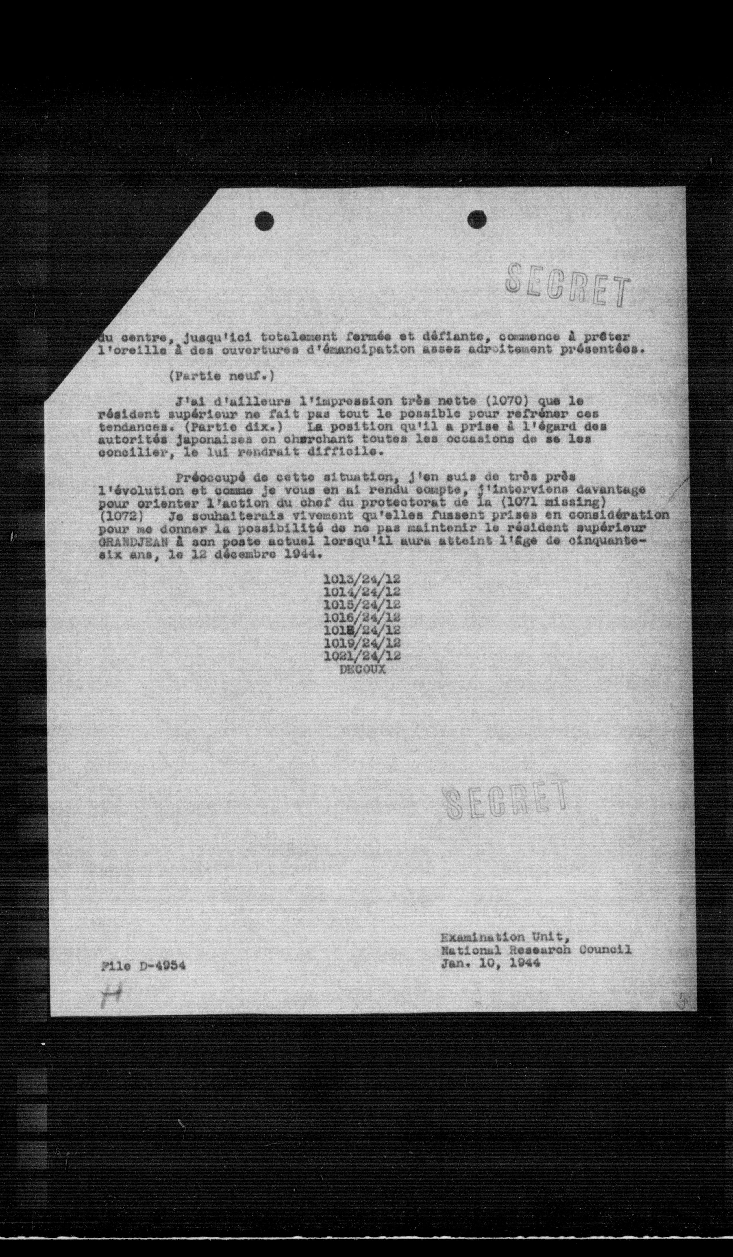 Précoupé de cette situation, j'en suis de très près l'évolution et comme je vous en ai rendu compte, j'interviens davantage pour orienter l'action du chef du protectorat de la (1071 missing) (1072). Je souhaiterais vivement qu'elles fussent prises en considération pour me donner la possibilité de ne pas maintenir le résident supérieur GRANDJEAN à son poste actuel lorsqu'il aura atteint l'âge de cinquante-six ans, le 12 décembre 1944.