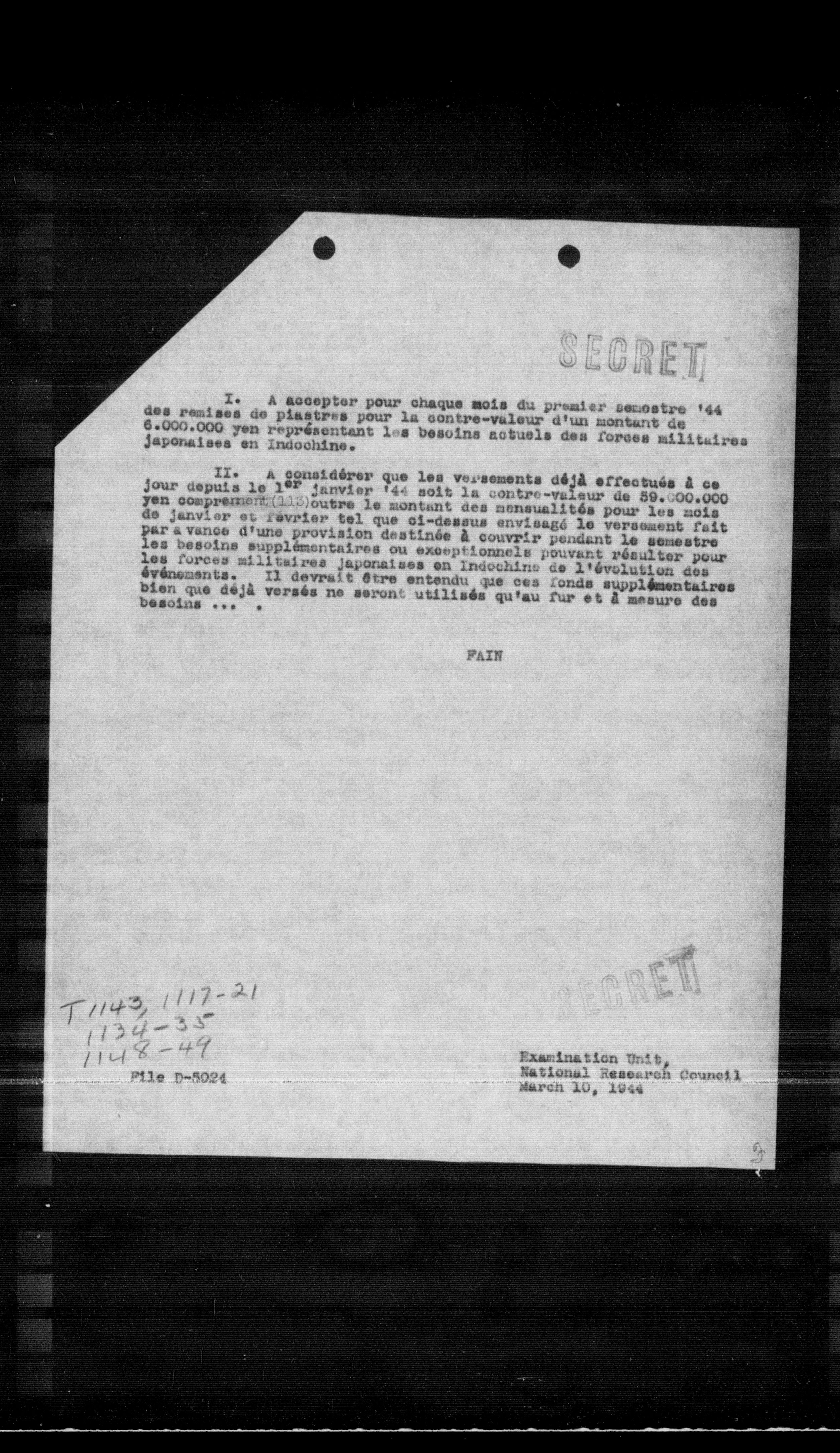 II. A considérer que les versements déja effectués a ce jour depuis le $1^{\text {er }}$ janvier 144 soit la contre-valeur de 89.000 .000 yen comprensible, autre le montant des mensualités pour les mois de janvier et février tal que ci-dessus envisagé le versement fait par a vance d'une provision destinée a couvrir pendant le semestre les besoins supplémentaires ou exceptionnels pouvant résulter pour les forces militaires japonaises en Indochine de l'évolution des événements. Il devrait être entendu que ces londs supplémentaires bien que déja versés ne seront utilisés qu'au fur et a mesure des besoins ...