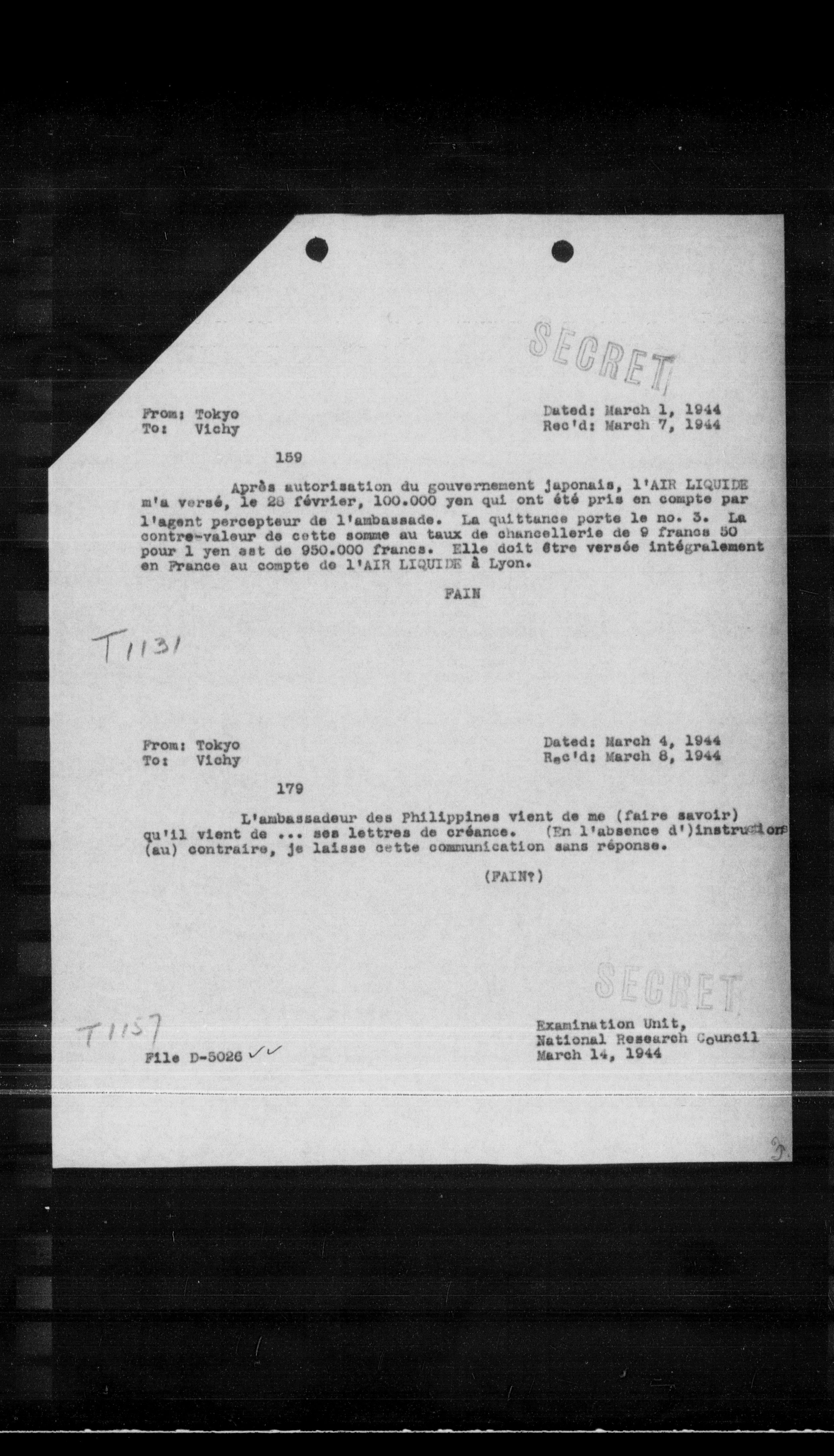 Après autorisation du gouvernement japonais, l'AIR LIQUIDE m'a versé, le 20 février, 100.000 yen qui ont été pris en compte par l'agent percepteur de l'ambassade. La quittance porte le no. 3. La contre-valeur de cette somme au taux de chancellerie de 9 francs 50 pour 1 yen est de 950.000 francs. Elle doit être versée intégralement en France au compte de l'AIR LIQUIDE à Lyon.