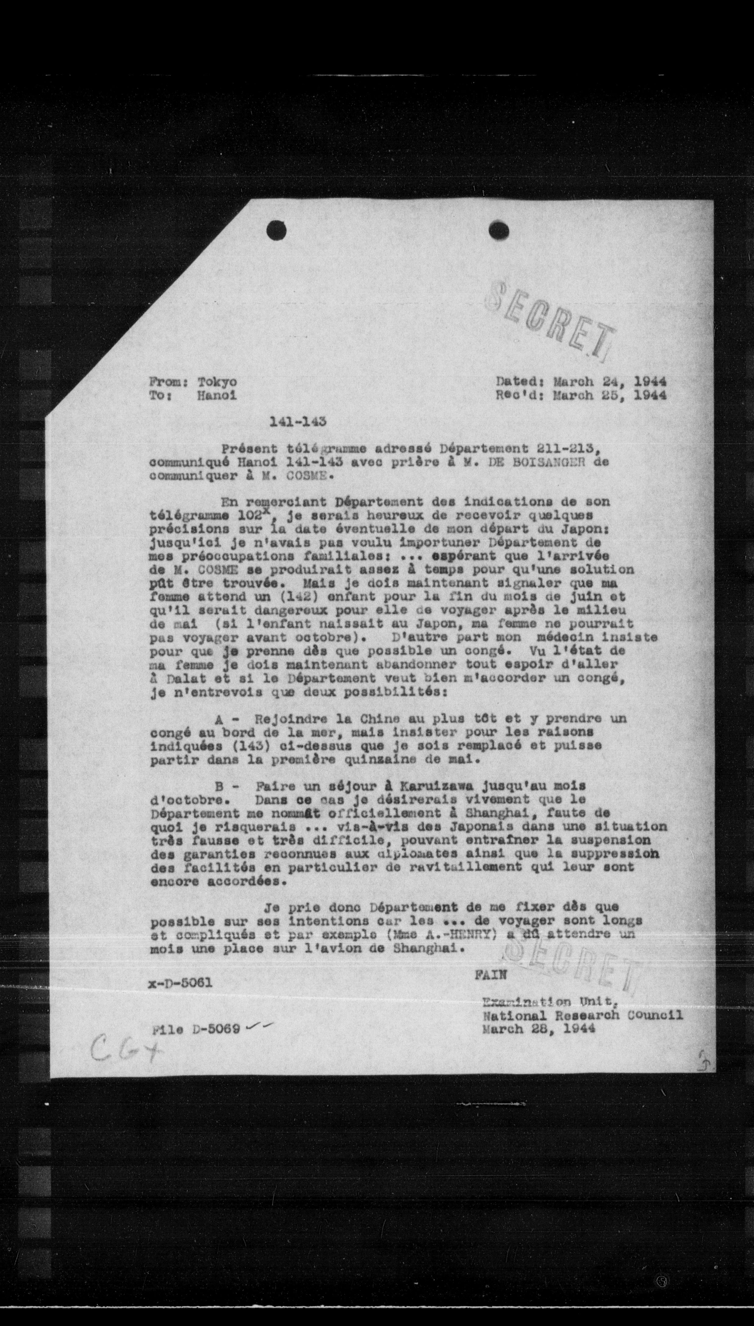 En remerciant Département des indications de son télégramme 102°, je serais heureux de recevoir quelques précisions sur la date éventuelle de mon départ du Japon; jusqu'ici je n'avais pas voulu impertuner Département de mes préoccupations familiales: ... espérant que l'arrivée de M. COSME se produirait assez à temps pour qu'une solution pût être trouvée. Mais je dois maintenant signaler que ma femme attend un (142) enfant pour la fin du mois de juin et qu'il serait dangereux pour elle de voyager après le milieu de mai (si l'enfant naissait au Japon, ma femme ne pourrait pas voyager avant octobre). D'autre part mon médecin insiste pour que je prenne dès que possible un congé. Vu l'état de ma femme je dois maintenant abandonner tout espoir d'aller à Malat et si le Département veut bien m'accorder un congé, je n'entrevois que deux possibilités: