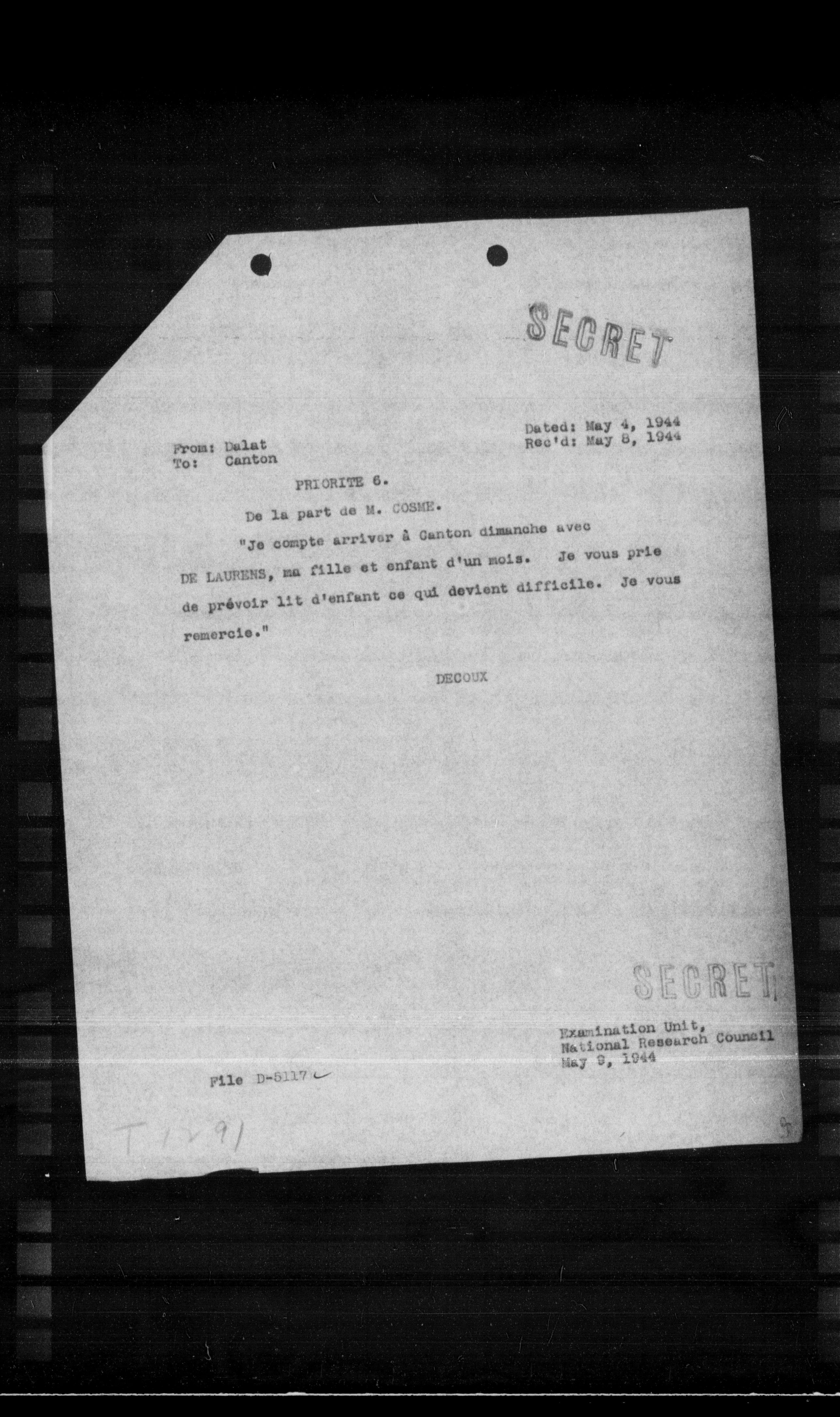**From:** Dalat **To:** Canton **Dated:** May 4, 1944 **Rec'd:** May 8, 1944