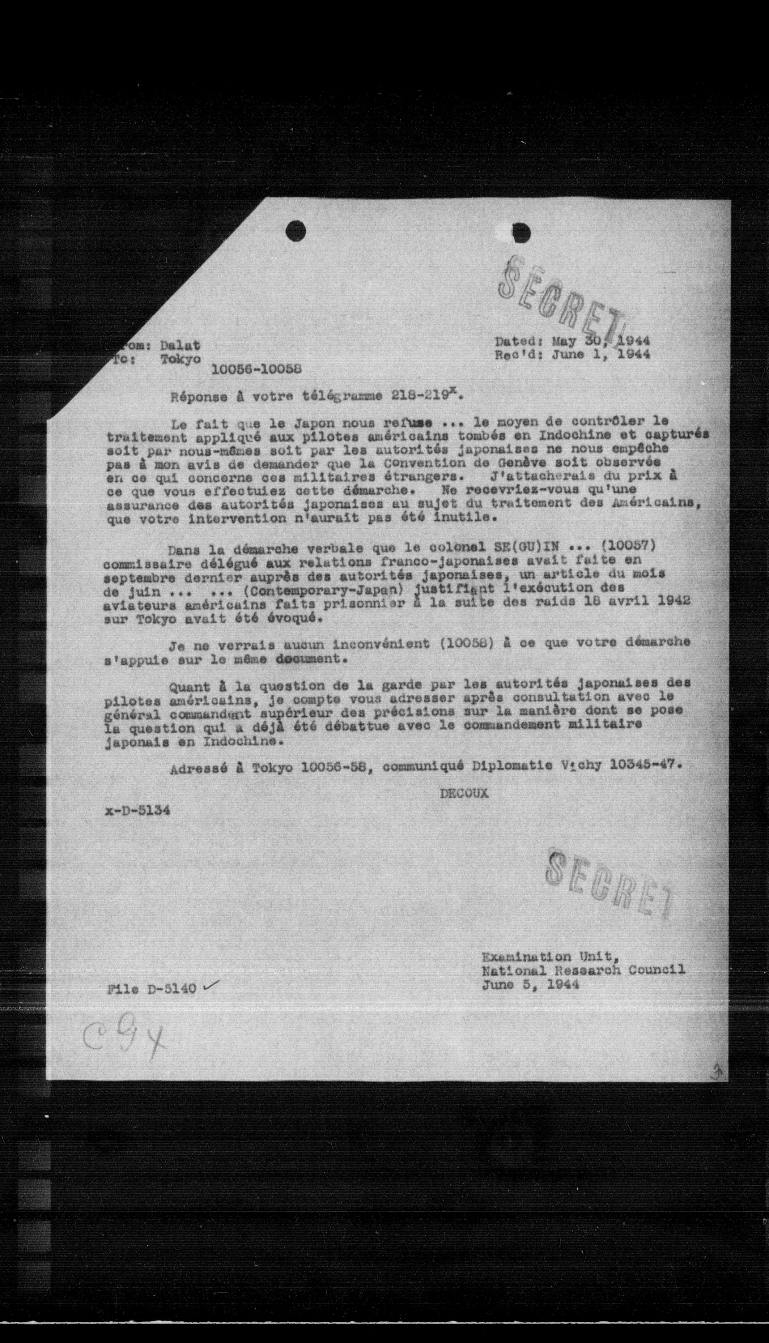 Le fait que le Japon nous refuse ... le moyen de contrôler le traitement appliqué aux pilotes américains tombés en Indochine et capturés soit par nous-mêmes soit par les autorités japonaises ne nous empêche pas à mon avis de demander que la Convention de Genève soit observée en ce qui concerne ces militaires étrangers. L'attachérais du prix à ce que vous effectuiez cette démarche. Ne recevriez-vous qu'une assurance des autorités japonaises au sujet du traitement des américains, que votre intervention n'aurait pas été inutile.