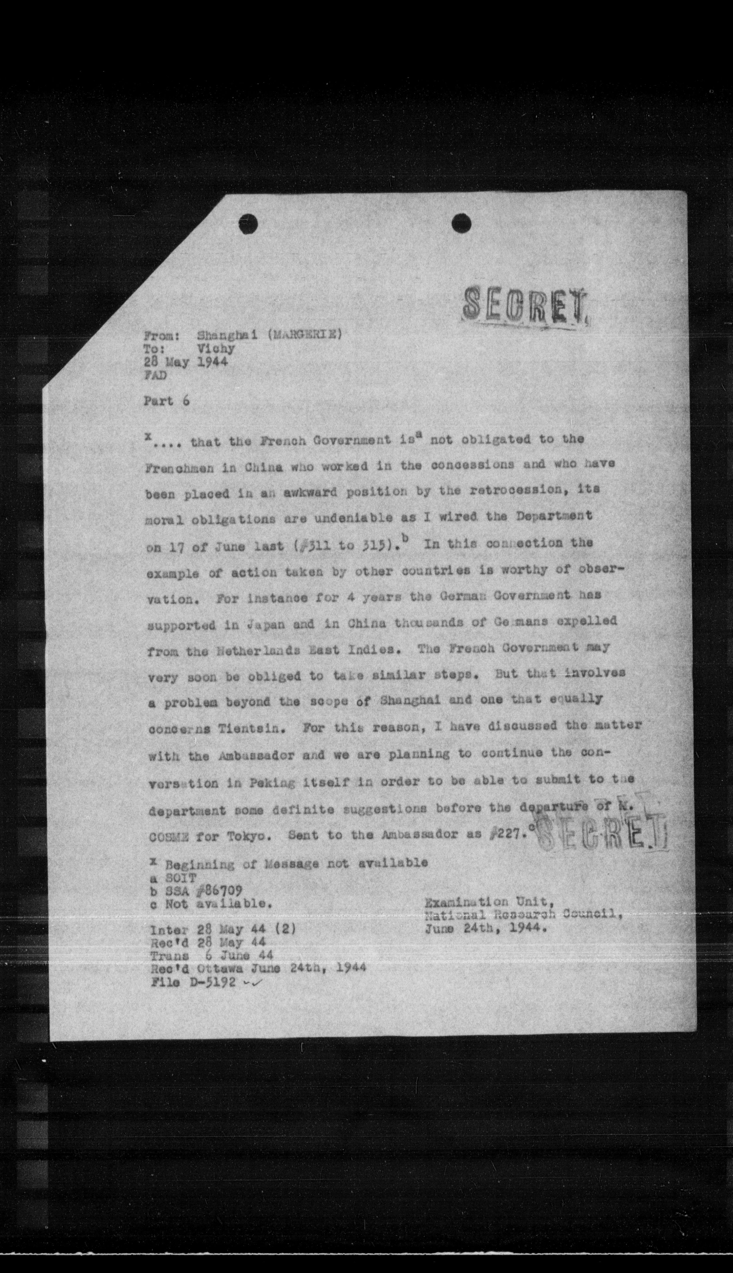2.... that the French Government is not obligated to the Frenchmen in China who worked in the concessions and who have been placed in an awkward position by the retrocession, its moral obligations are undeniable as I wired the Department on 17 of June last (§511 to §15). In this connection the example of action taken by other countries is worthy of observation. For instance for 4 years the German Government has supported in Japan and in China thousands of Germans expelled from the Netherlands East Indies. The French Government may very soon be obliged to take similar steps. But that involves a problem beyond the scope of Shanghai and one that equally concerns Tientsin. For this reason, I have discussed the matter with the Ambassador and we are planning to continue the conversation in Peking itself in order to be able to submit to the department some definite suggestions before the departure of K. COSSE for Tokyo. Sent to the Ambassador as 2227.