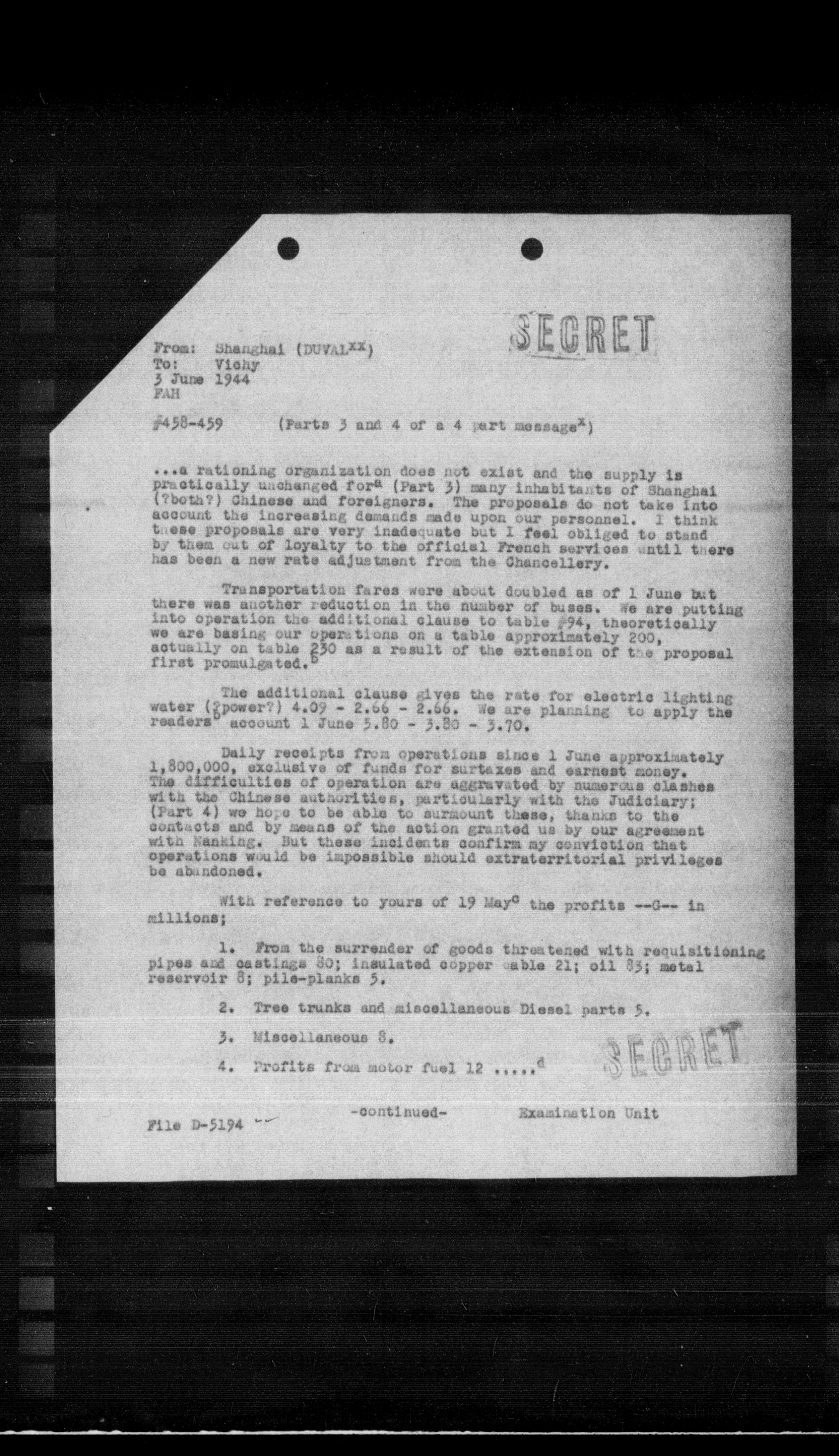...a rationing organization does not exist and the supply is practically unchanged for (Part 3) many inhabitants of Shanghai (Tbetn?) Chinese and foreigners. The proposals do not take into account the increasing demands made upon our personnel. I think these proposals are very inadequate but I feel obliged to stand by them out of loyalty to the official French services until there has been a new rate adjustment from the Chancellery.