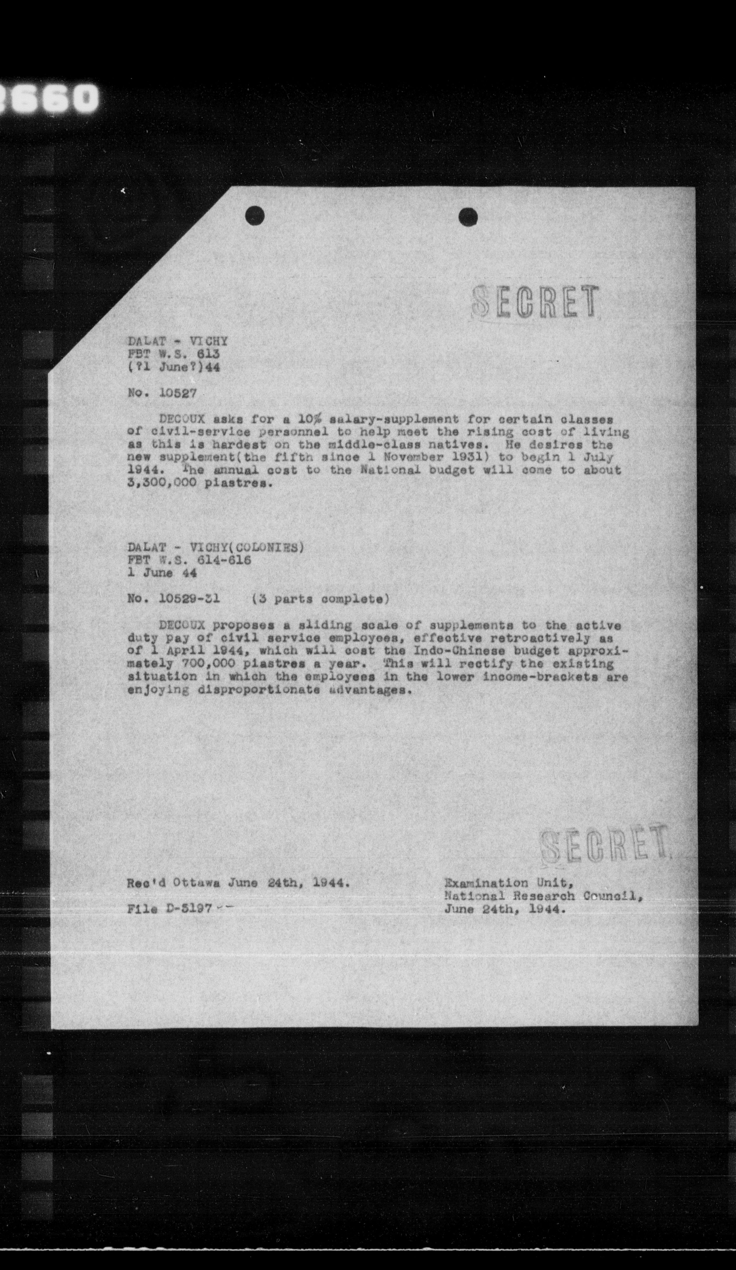 DECOUX proposes a sliding scale of supplements to the active duty pay of civil service employees, effective retroactively as of 1 April 1944, which will cost the Indo-Chinese budget approximately 700,000 palates a year. This will rectify the existing situation in which the employees in the lower income-breakets are enjoying disproportionate advantages.