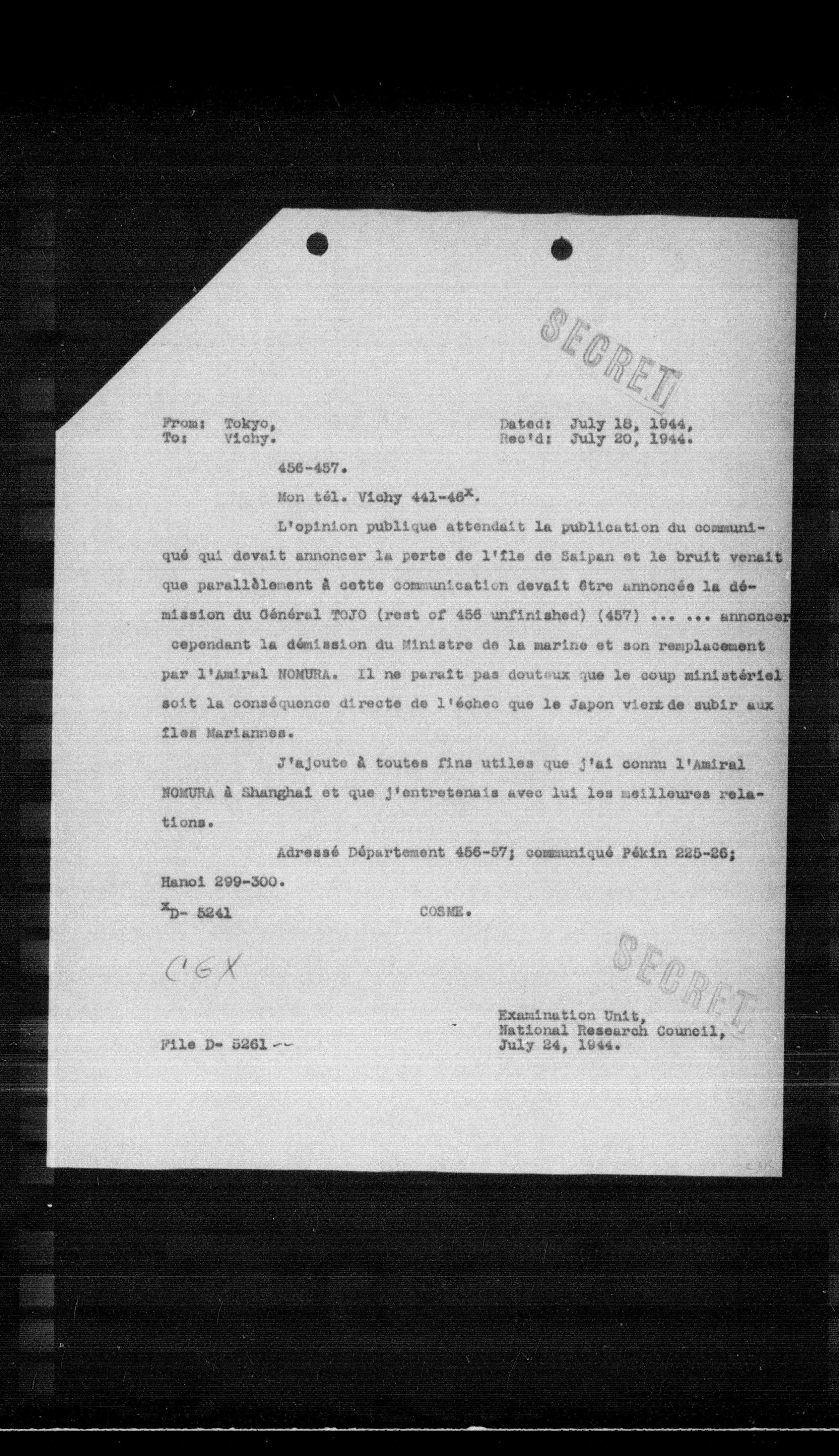 L'opinion publique attendait la publication du communiqué qui devait annoncer la perte de l'fle de Saipan et le bruit venait que parallèlement à cette communication devait être annoncée la démission du Général TOJO (rest of 456 unfinished) (457) ...... annoncer cependant la démission du Ministre de la marine et son remplacement par l'æmiral NOMURA. Il ne parait pas douteux que le coup ministériel soit la conséquence directe de l'échec que le Japon vient de subir aux fles Mariannes.