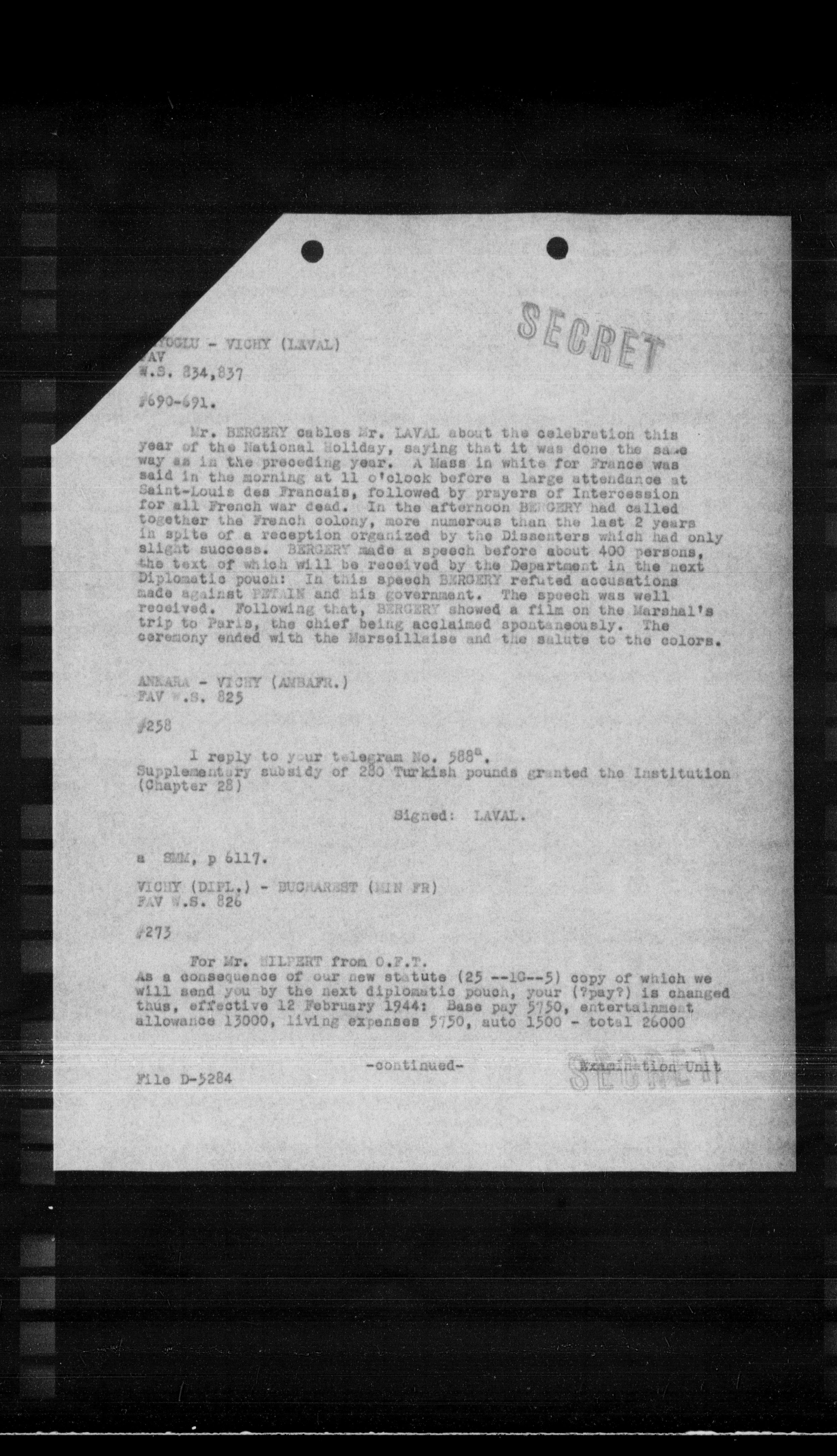 Mr. BERGERY cables Mr. LAVAL about the celebration this year of the National Holiday, saying that it was done the same way as in the preceding year. A Mass in white for France was said in the morning at 11 o'clock before a large attendance at Saint-Louis des Français, followed by prayers of Intercession for all French war dead. In the afternoon BERGERY had called together the French colony, more numerous than the last 2 years in spite of a reception organized by the Dissenters which had only slight success. BERGERY made a speech before about 400 persons, the text of which will be received by the Department in the next diplomatic pouch: In this speech BERGERY refuted accusations made against PETLIS and his government. The speech was well received. Following that, BERGERY showed a film on the Marshal's trip to Paris, the chief being acclaimed spontaneously. The ceremony ended with the Marseillaise and the salute to the colors.